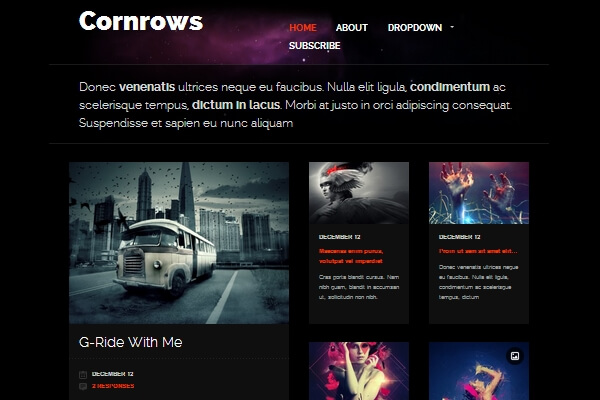 Cornrows is a dark blog theme, designed for blogs and magazines. It features a fluid based design, responsive CSS, gravity forms integrated styles, and a custom showcase template.