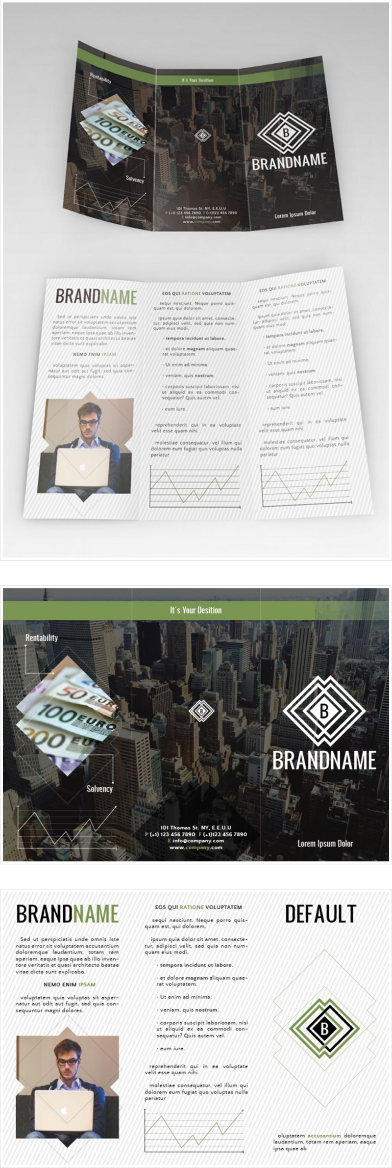 This trifold design meant for introducing a new brand or corporate idea, comes in Ai, PSD and INDD formats. Has an outside cover of a city where the logo design can be placed, and the inside is and info-focused one, fully editable and easy to customize.