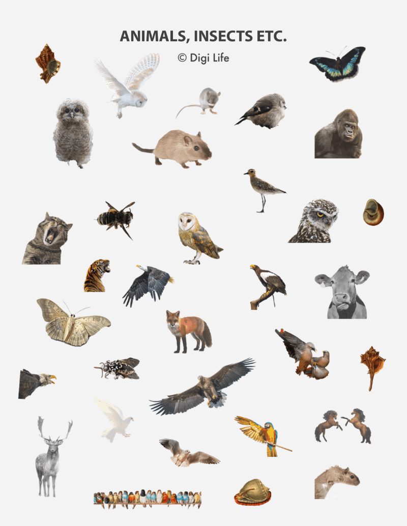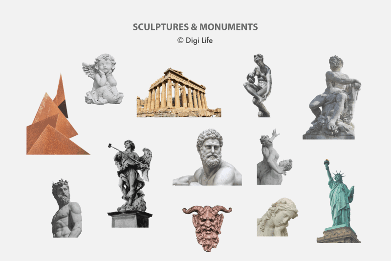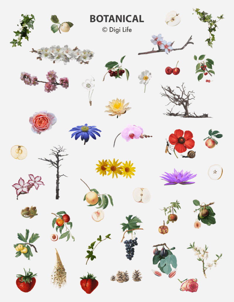 - Botanical elements, sculptures, animals, people, vintage objects & more