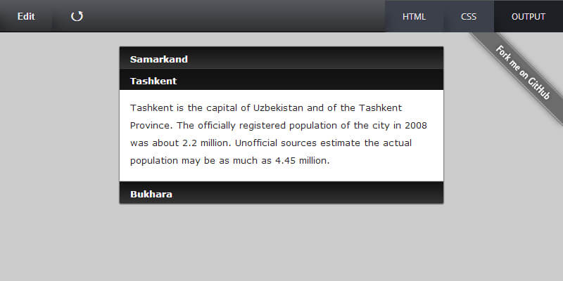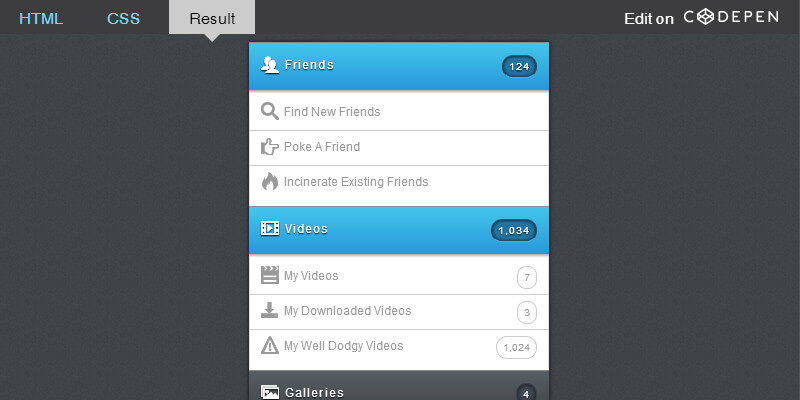 Collection of Accordion effects for Drop Down Menus, Image Sliders, Nav Menus, and much more, all made in CSS in several styles and with varying degrees of complexity.