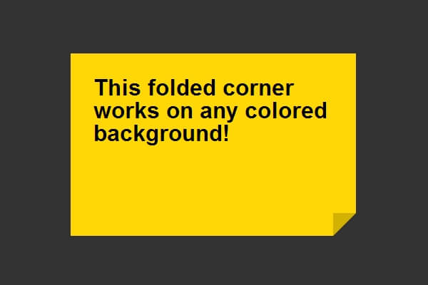 This is building off of Nicolas Gallagher’s “Pure CSS folded-corner effect” (http://tinyurl.com/37rl4fe). Easily works on any colored background.You can add the .post-it-note class to an element and it will work, regardless of the background color/image of the containing element. Change the background color of the body to try it out.Nice solution. Made something similar myself using background gradients a few weeks ago: http://codepen.io/carlcalderon/pen/IgCdD@carlcalderon Thanks man. Those css …