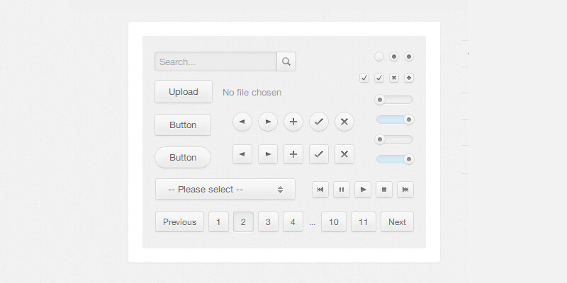 This awesome project from Matt Gentile does not go for the usual PSD format, but instead provides a complete UI kit fully coded in CSS3! The set itself is quite complete, including upload buttons with pop-up windows, sliders, playback controls, dropdowns and many more elements.