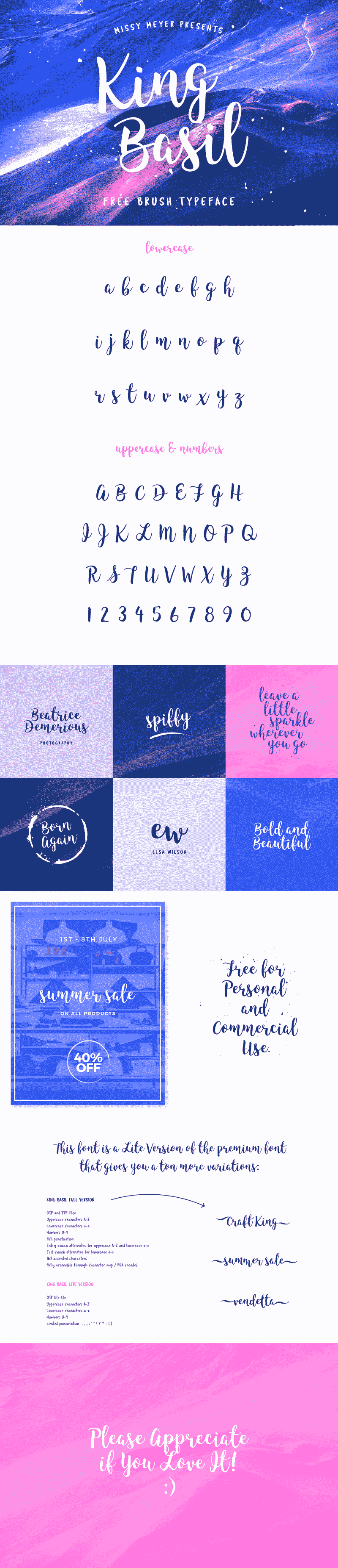 This is a Lite version of the full King Basil, that contains a lot of swashes and connecting letters. This version includes upper and lowercase characters, numbers and limited punctuation. It includes personal and commercial use