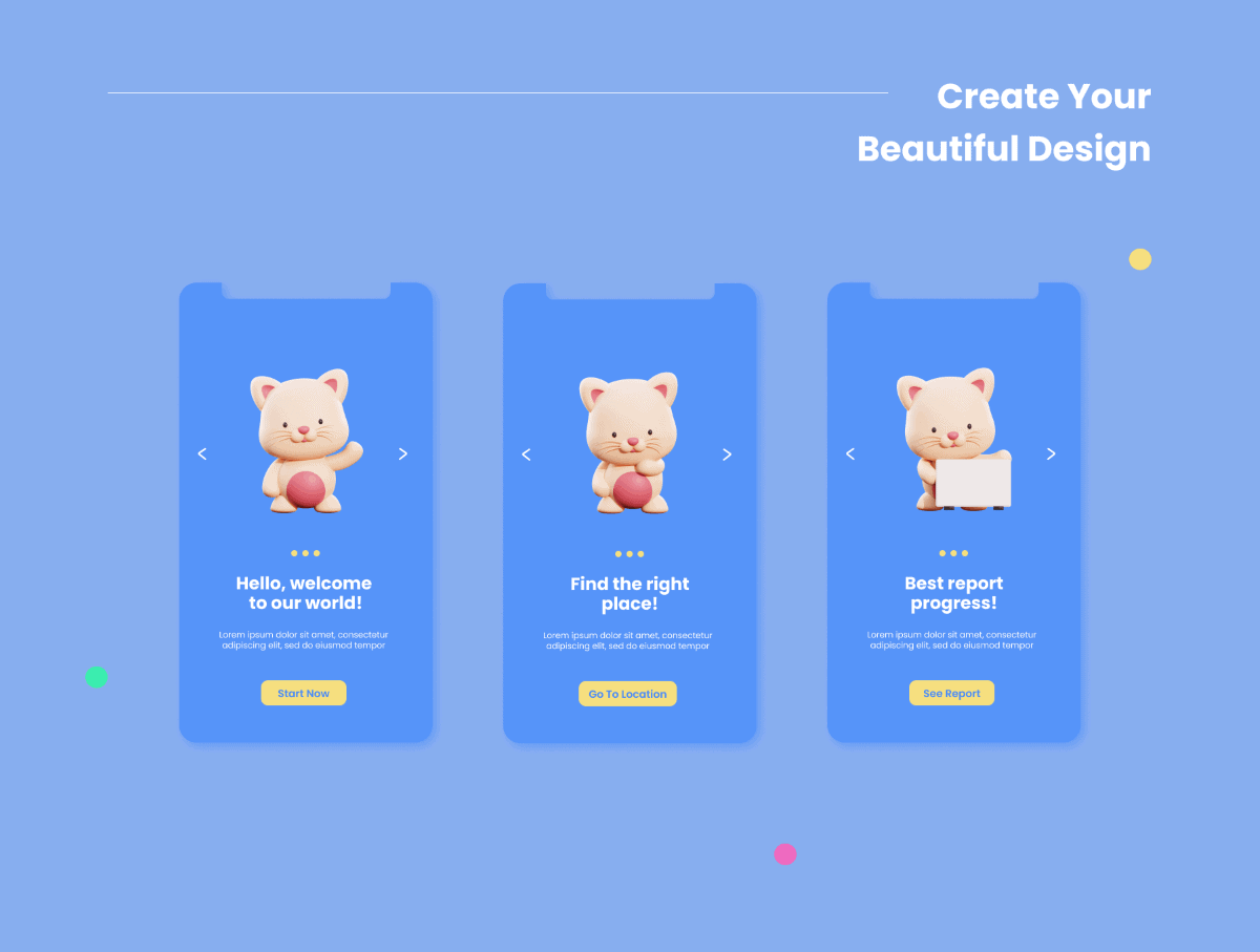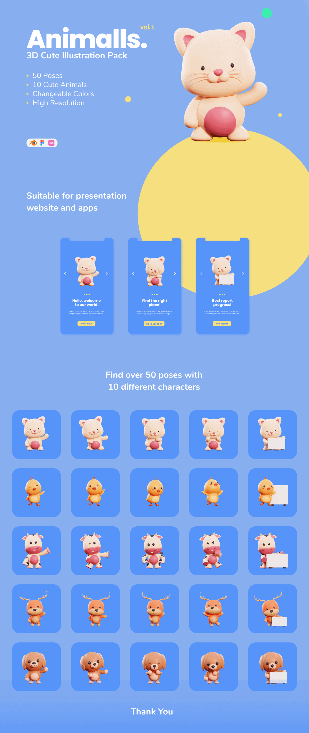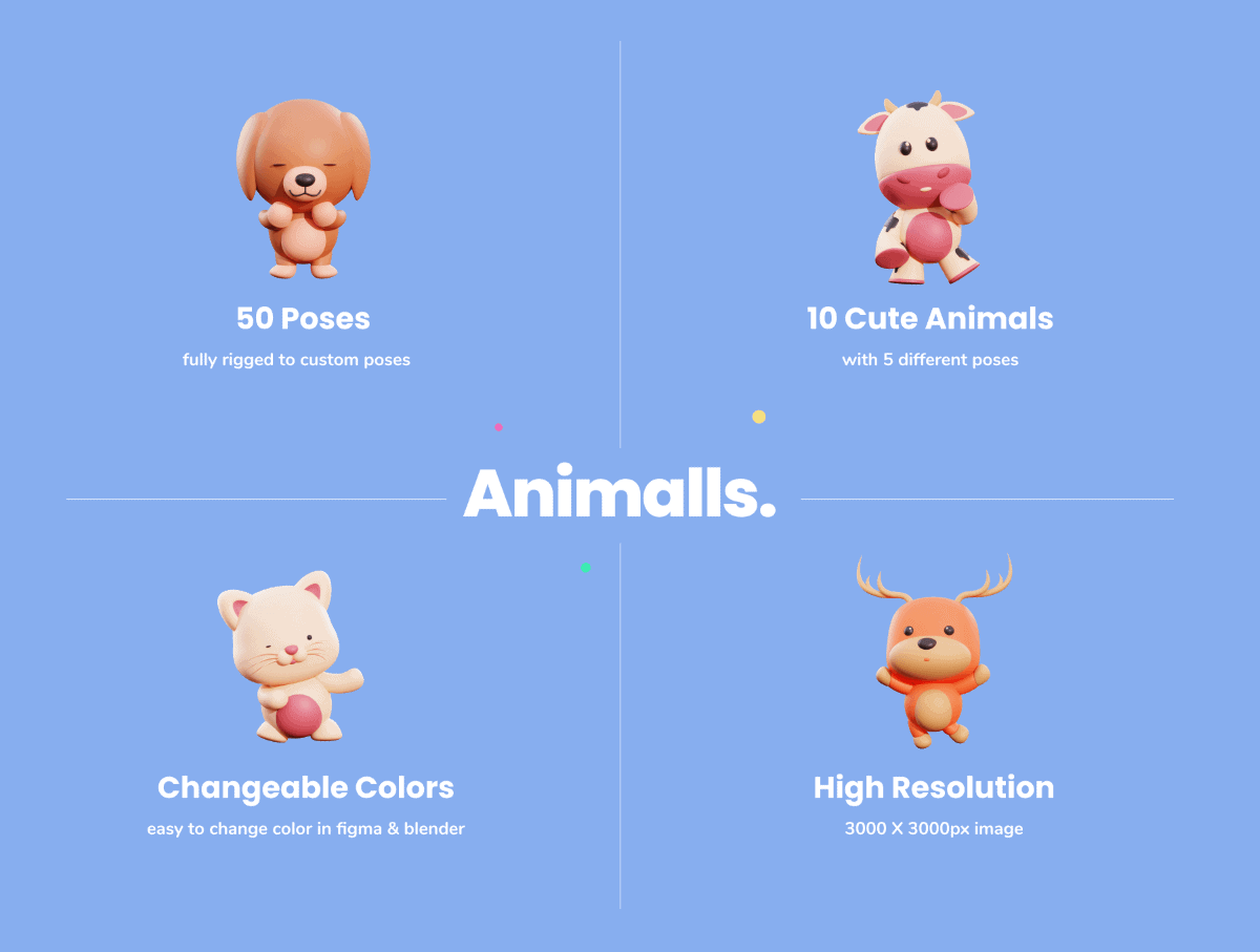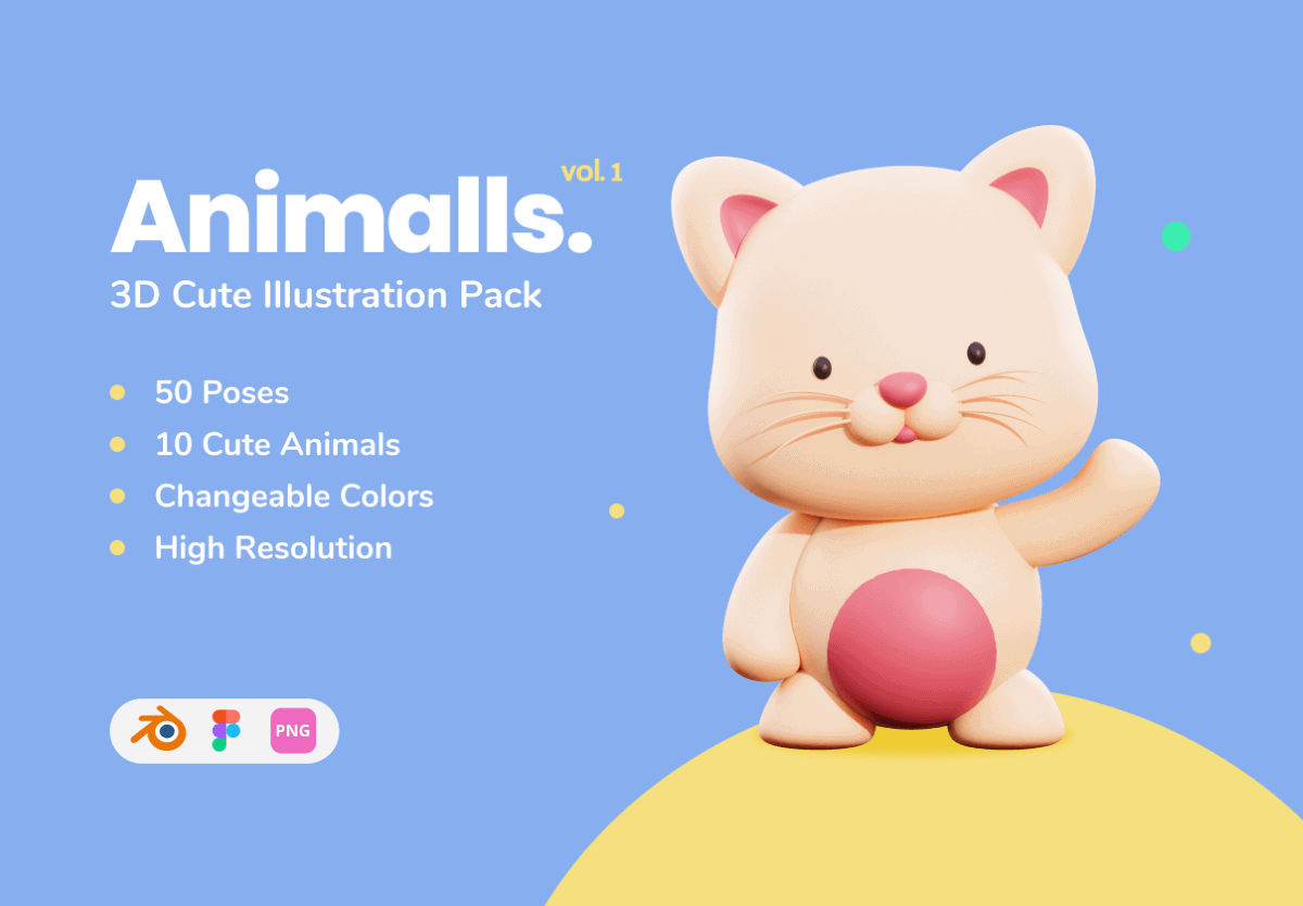 This set contains 50 stylish and cute 3D animal characters featuring fully customizable source files as well as use-ready renders of the characters in a variety of different poses, perfect to use as avatars and elements in landing pages, mobile apps, presentations and more