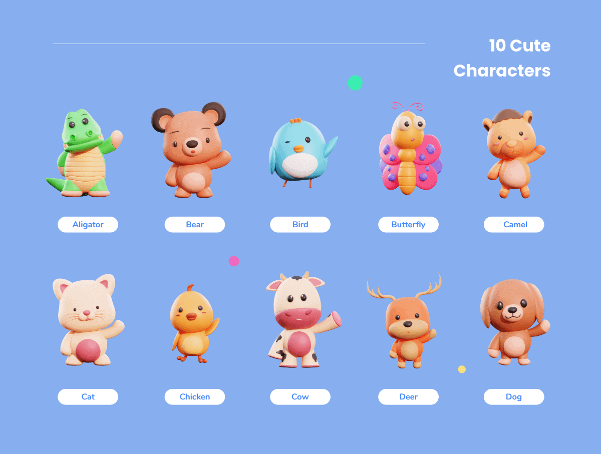 - Alligator, Bear, Bird, Butterfly, Camel, Cat, Chicken, Cow, Deer & Dog characters