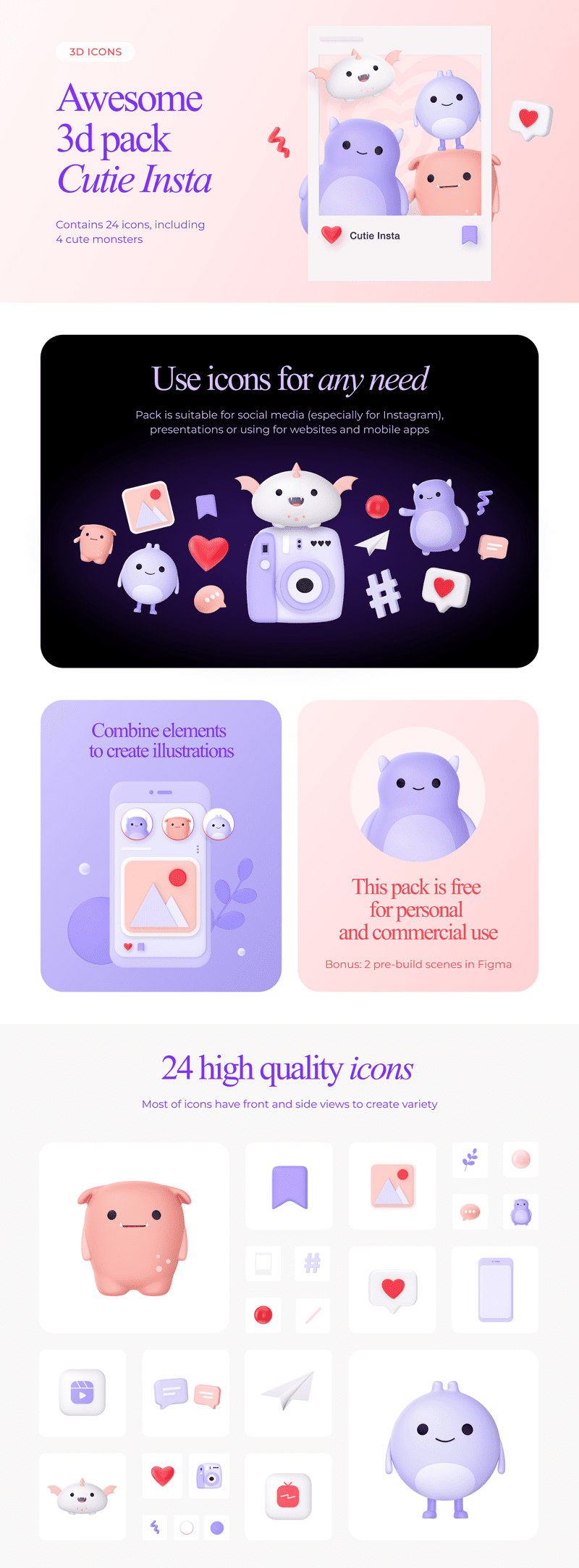 Besides getting ready-to-use PNGs with radiant blues, oranges, reds, and pinks that bring the composition to life, you’ll also receive files for Figma so you can fully customize their colors and create awesome content in a consistent 3D design style