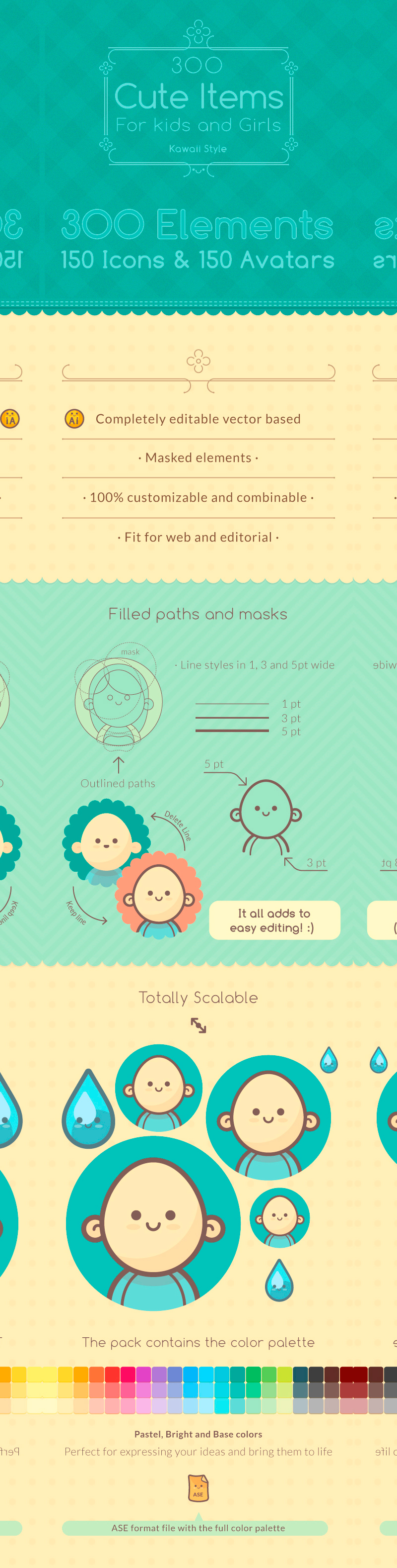 A cute avatar and icons set designed for boys and girls made in Adobe Illustrator. It has a nice kawaii style, including hundreds of possible combination. It has 150 icons, 150 avatars and all of them are fully editable.