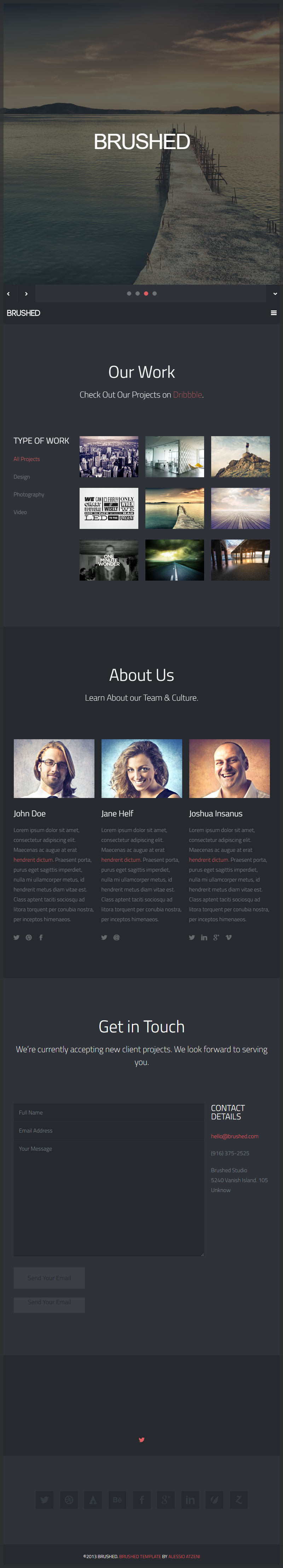 Graphic designer Alessio Atzeni delivers this stunning template dubbed Brushed, a dark HTML featuring a single column layout and responsive design, with a CSS animated image gallery to showcase works & projects. The template has a simple flat design, complemented with blog posts thumbs, portfolio area, about us, contact and social icons. Also, it is completely free!