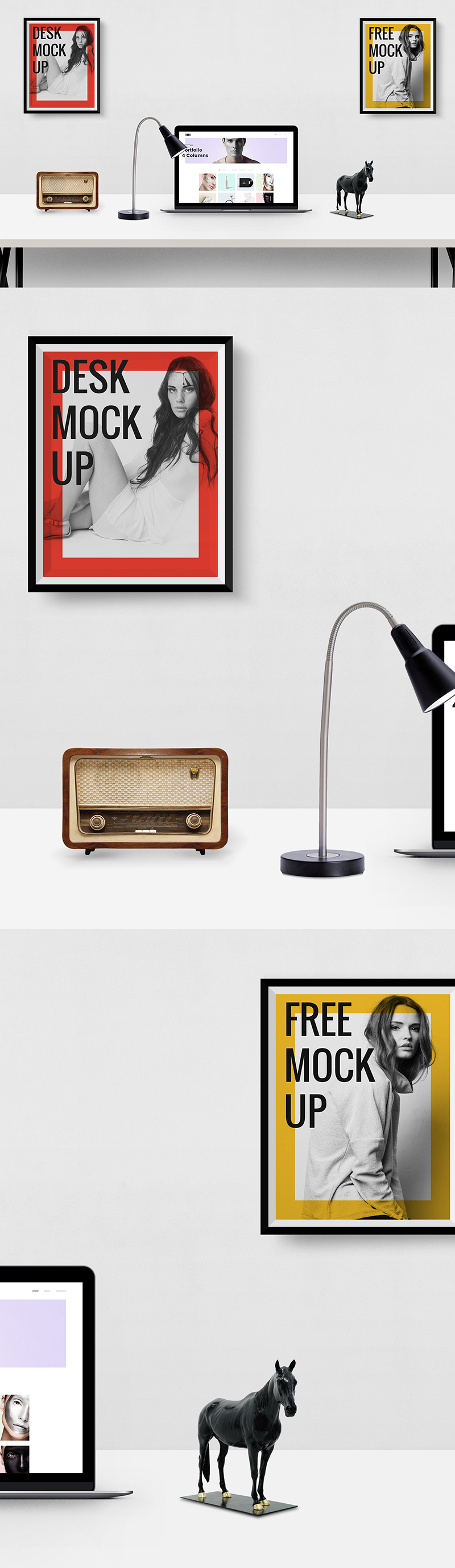 This cool PSD mockup contains a laptop, two poster frames, and three decorative items. All the items are over a white desk and a white wall. Perfect for quick and smooth presentations.