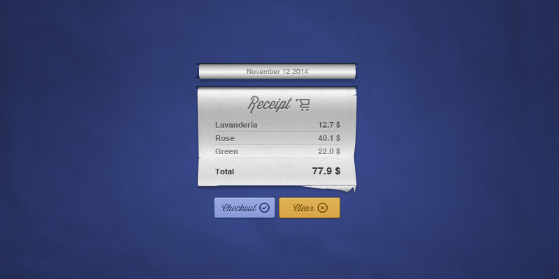 This is a PSD receipt for commercial websites. Designed with attention to small details by Dribble’s user Wassim, it is a nice realistic widget resembling a parchment. It has three part, at the top, one for the date, the middle one for the content, which includes a title, some list items with values and the total, and at the bottom we can find two buttons, one for checkout and clear. You can download it for free.