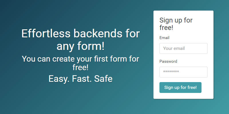 An easy, fast and safe backend form builder, it uses simple HTML, it simple to integrate, and it’s automatically backed. Your free subscription has 1 form and unlimited entries + SSL subscriptions.