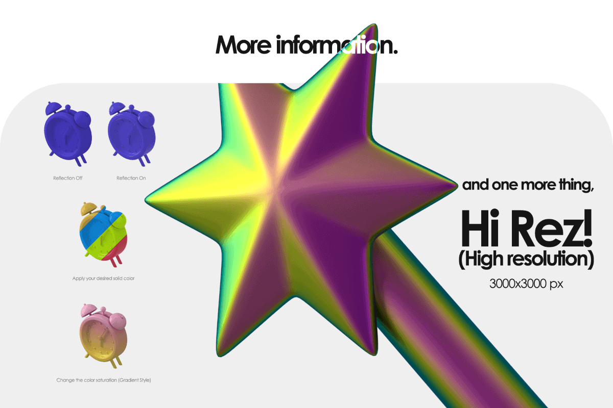 Each icon is prepared as an open layer in a separate PSD file, dimensions 3000x3000px, with high resolution for both print or digital media (300dpi). Each one of them is available with 3 different camera angles as well as 5 different textures. You can easily apply your desired color on your desired area and even change the amount of reflection and also change the saturation of the gradient layer with just a few clicks.