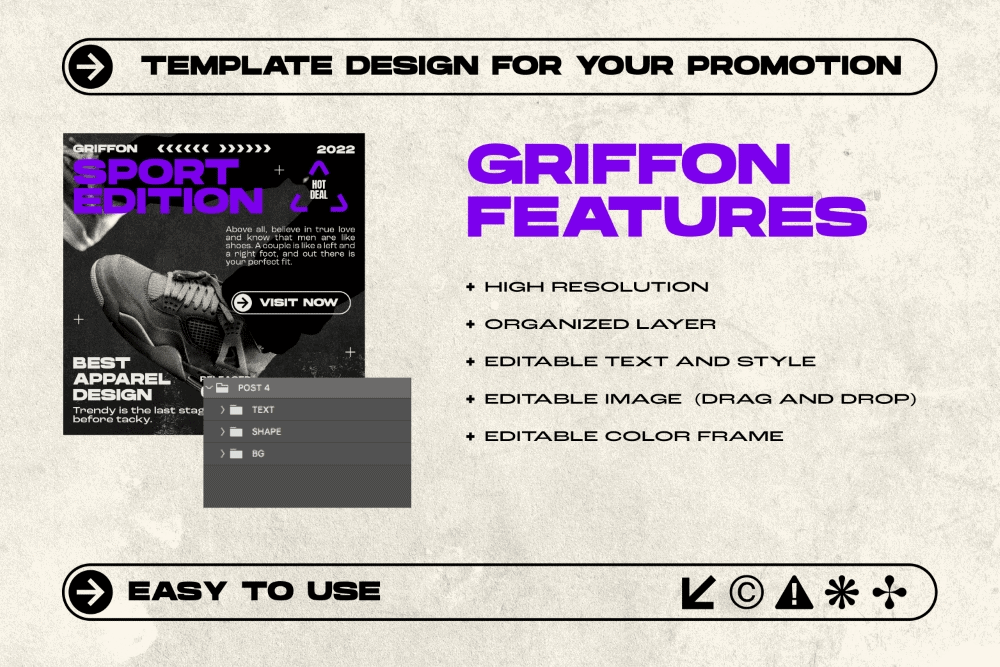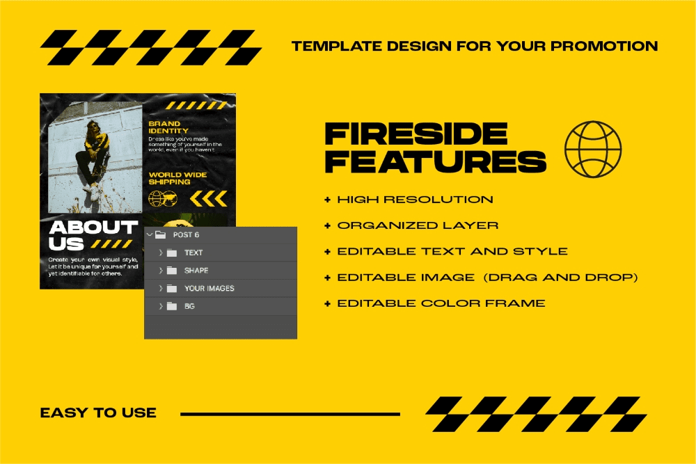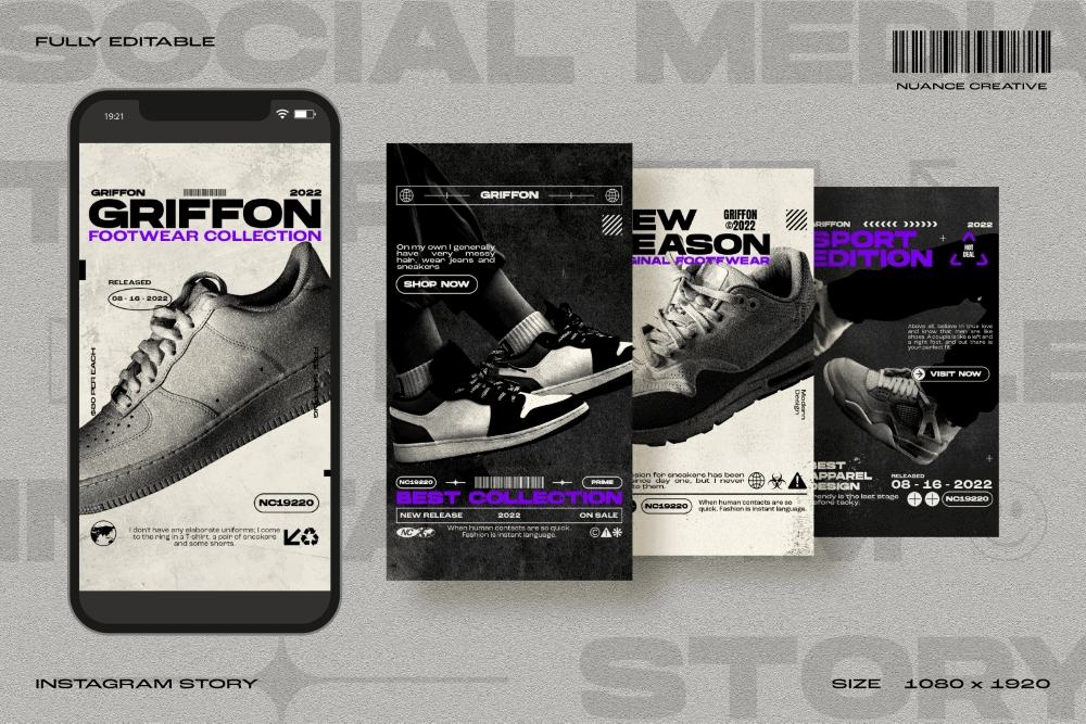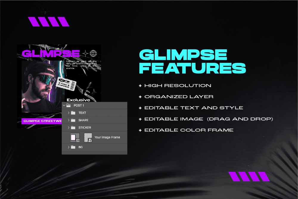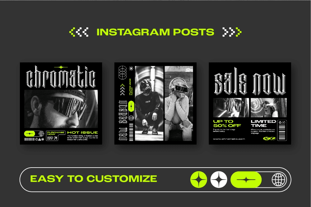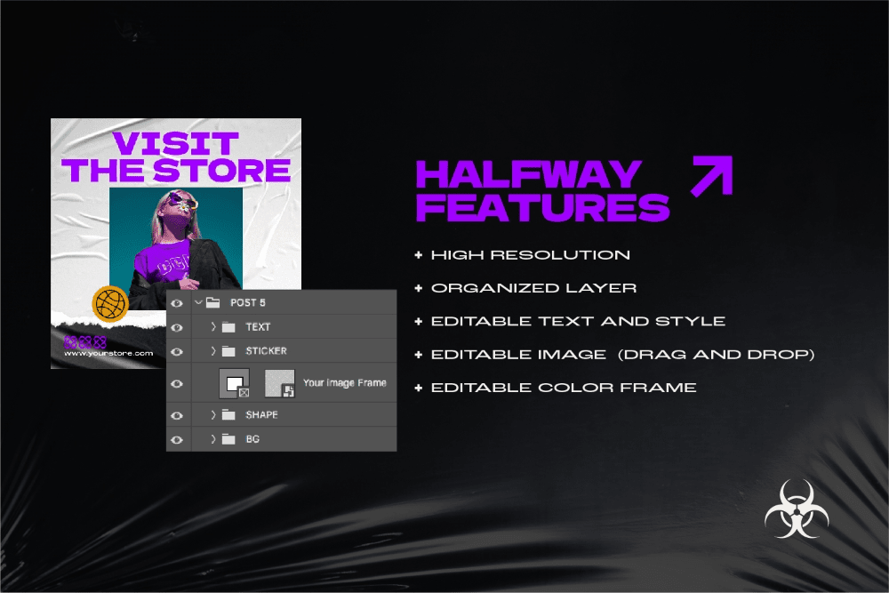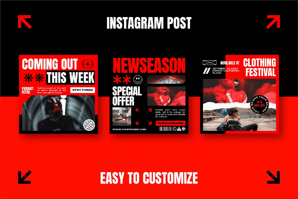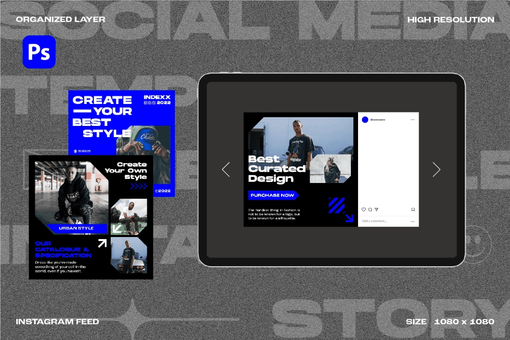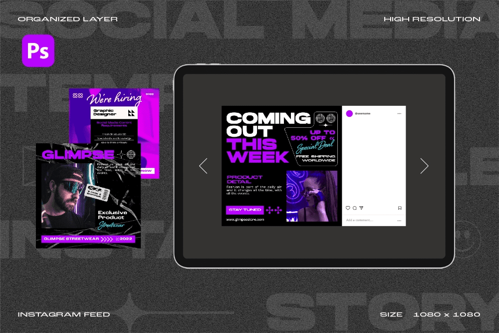 Every template is fully editable in Adobe Photoshop, with proper default sizes for Posts (1080x1080px), and Stories (1080x1920px). These templates are all delivered in PSD format with organized layers, vector shapes and placeholders for images so you can simply drag & drop to populate them with your own content