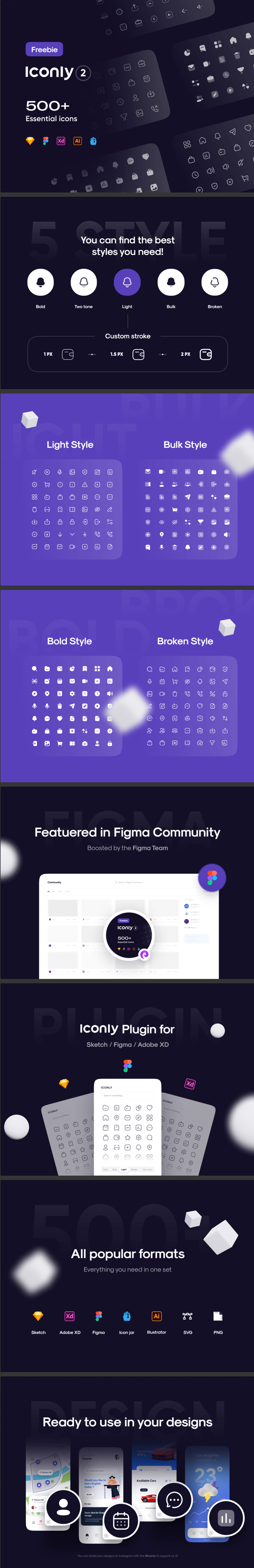 Check out this awesome pack containing 500+ Free icons for your existing or future project in 5 styles (Light, Bold, Bulk, Two-tone, Broken). It includes several file formats as well as plugins for popular tools like Sketch, Figma, and Adobe XD. Find out more free icons here.