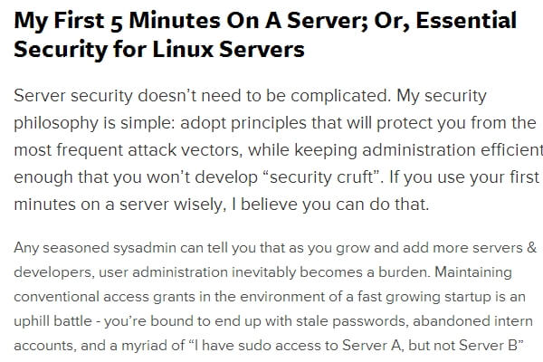 Server security doesn’t need to be complicated. My security philosophy is simple: adopt principles that will protect you from the most frequent attack vectors, while keeping administration efficient enough that you won’t develop “security cruft”. If you use your first 5 minutes on a server wisely, I believe you can do that.