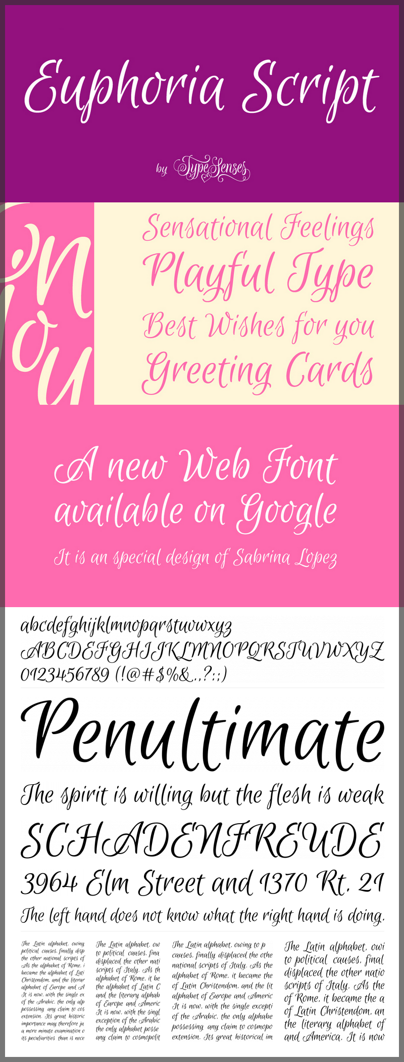 Euphoria Script is an informal script type. It began as handmade letterform sketches made with a copperplate nib, which were redrawn digitally with the stroke endings of a brush script. It will be perfect for titles and short phrases in branding, magazines, content about food, fashion, music and so on.