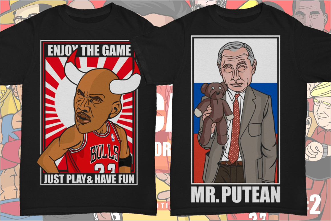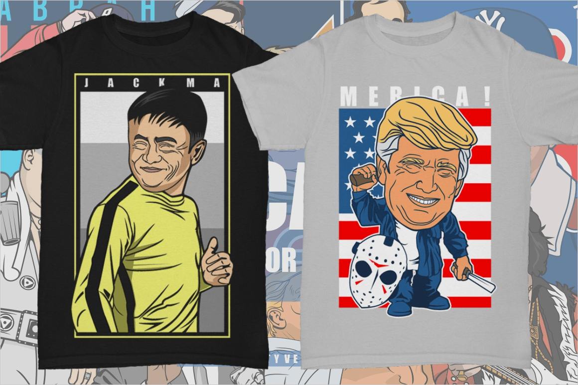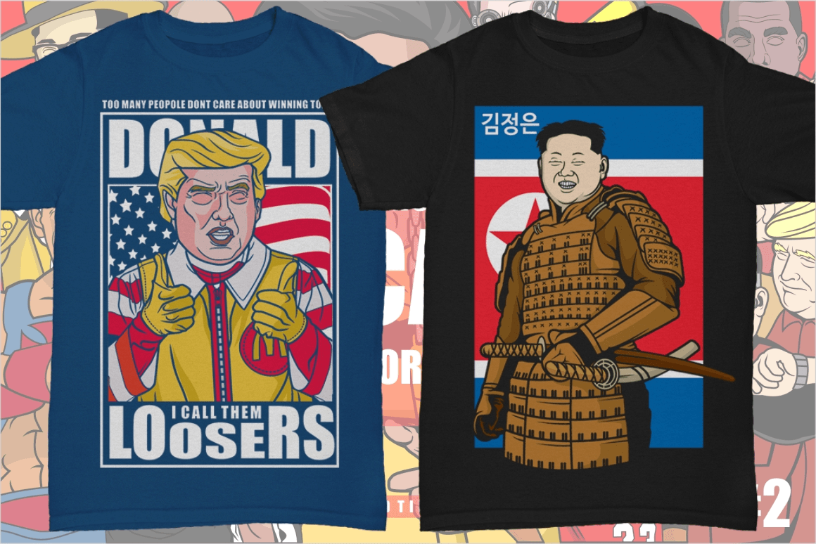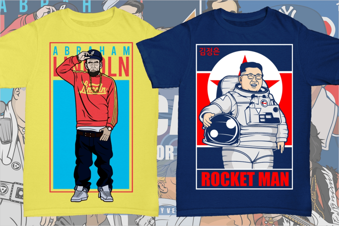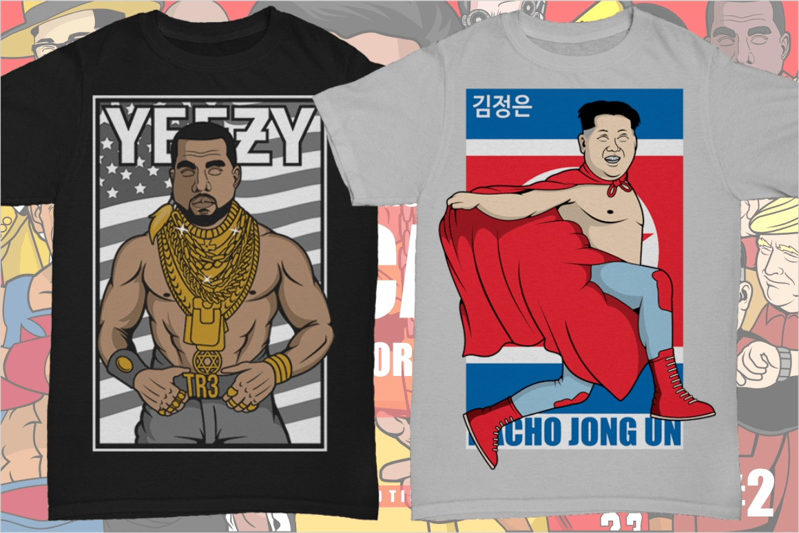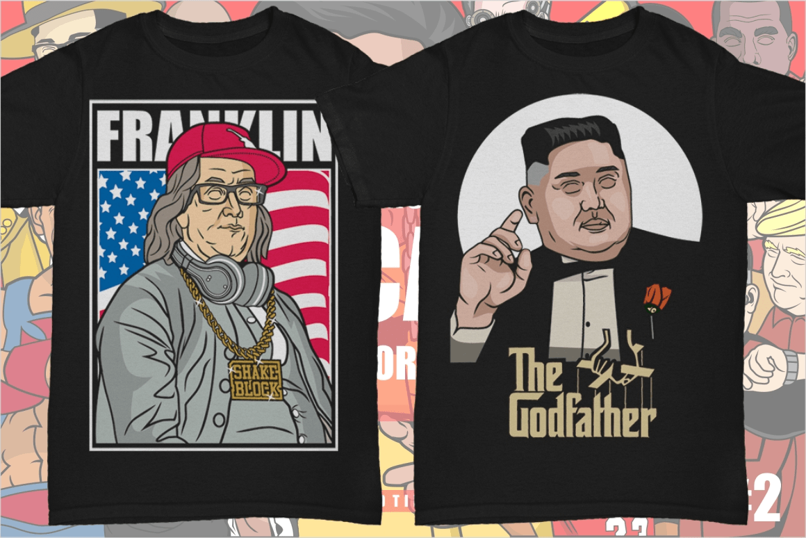 These illustrations feature a fun drawing style and include political figures like Donal Trump caricatures, Obama, Putin, Joe Biden & Kim Jong-un as well as movie stars & musicians like Dwayne Johnson, Kanye West and many more! Great for t-shirt printing, posters, digital media for satire, comedy, commentary and more