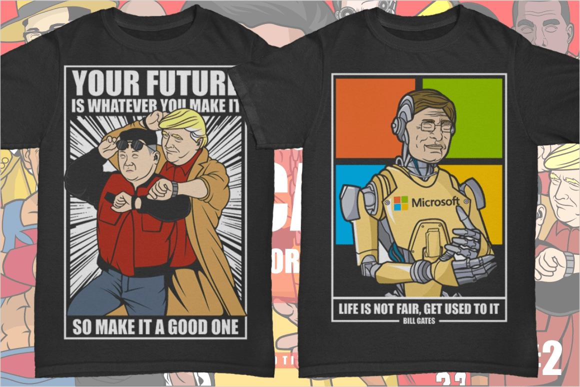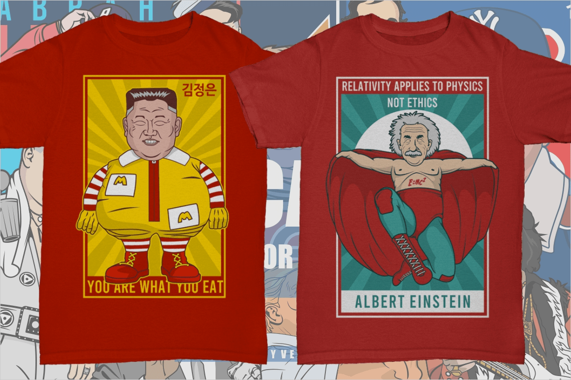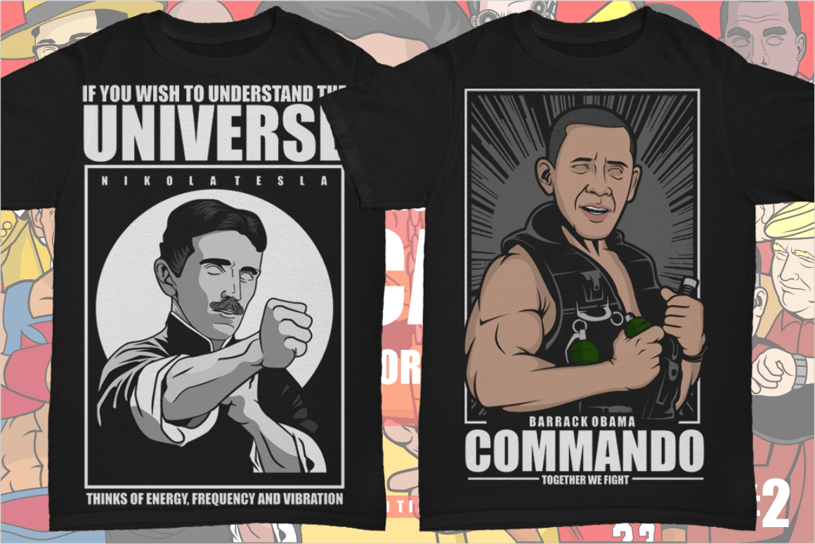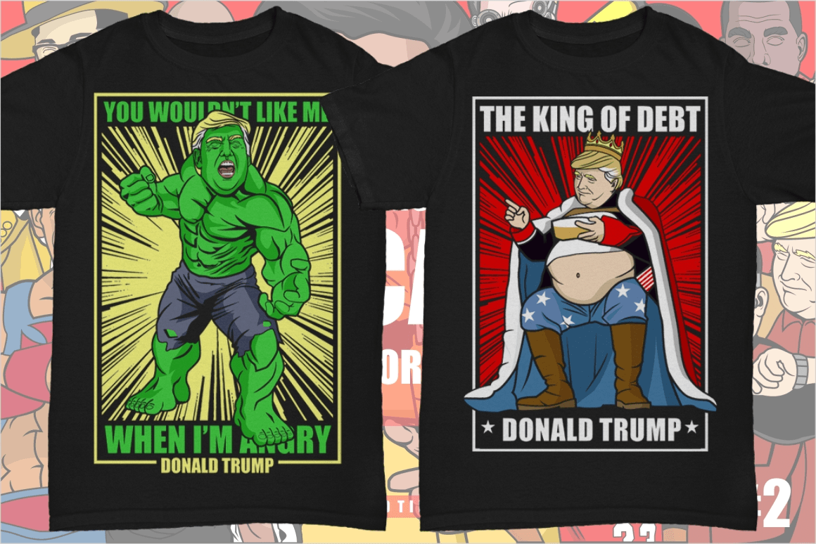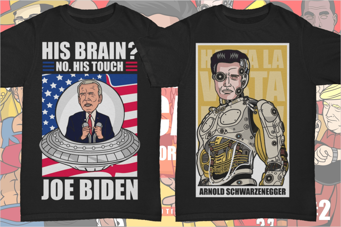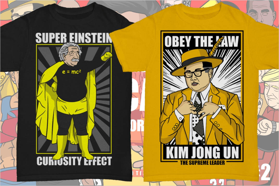 These illustrations feature a fun drawing style and include political figures like Donal Trump caricatures, Obama, Putin, Joe Biden & Kim Jong-un as well as movie stars & musicians like Dwayne Johnson, Kanye West and many more! Great for t-shirt printing, posters, digital media for satire, comedy, commentary and more