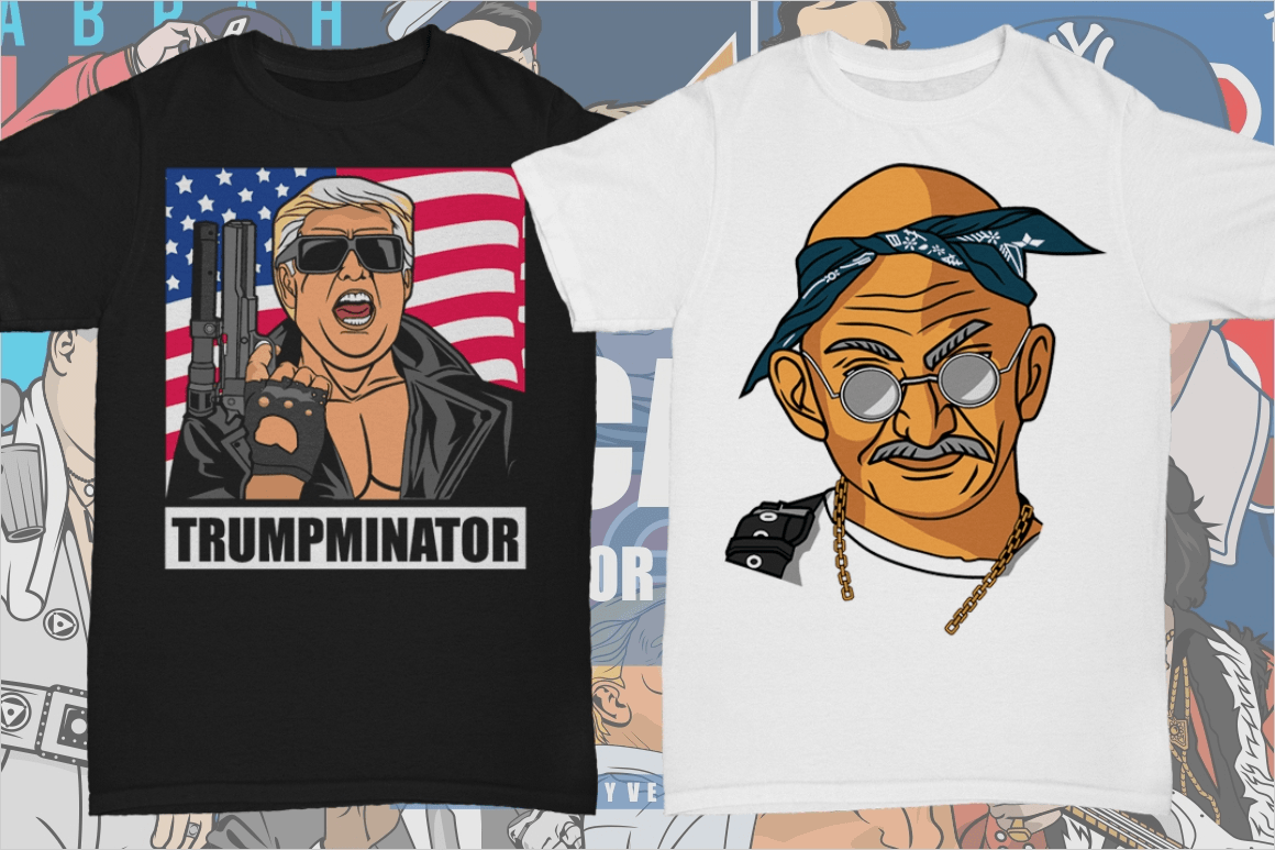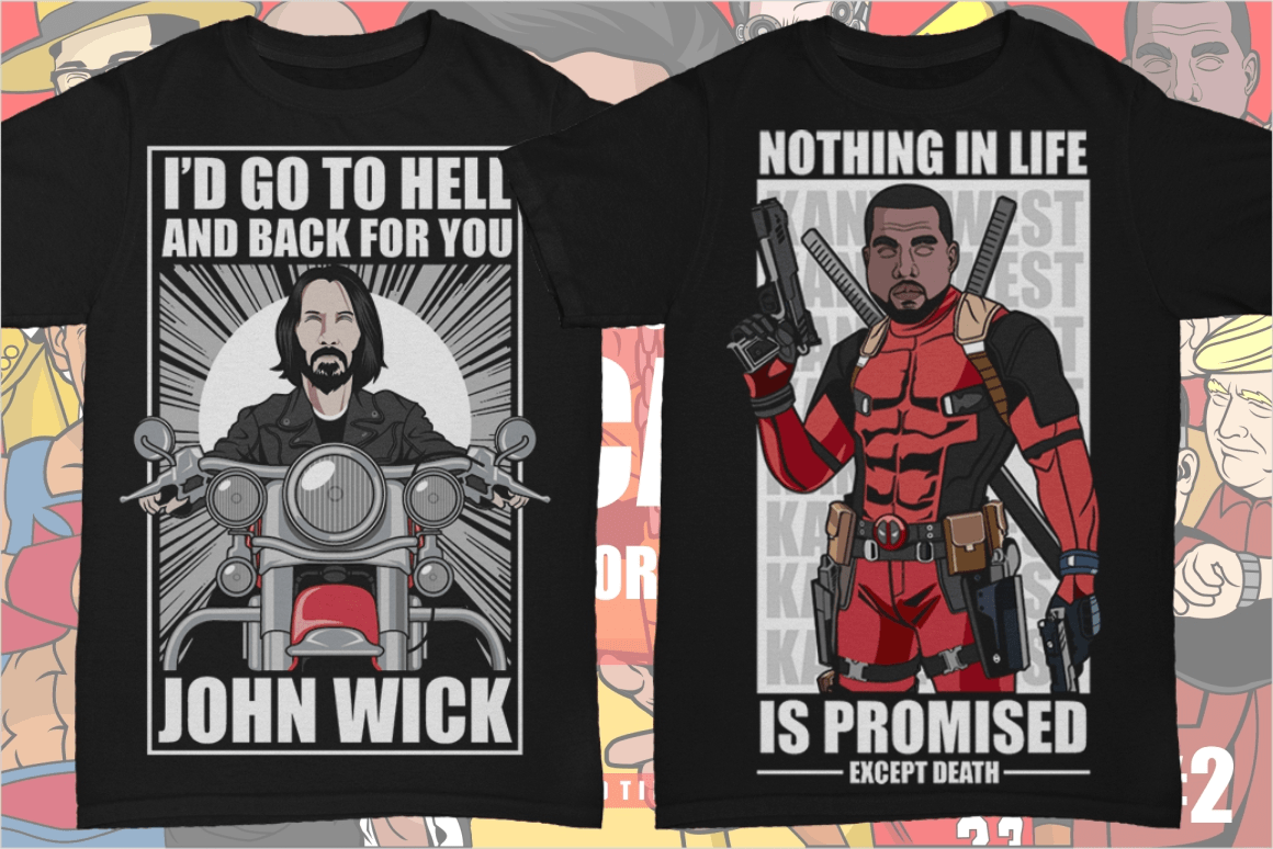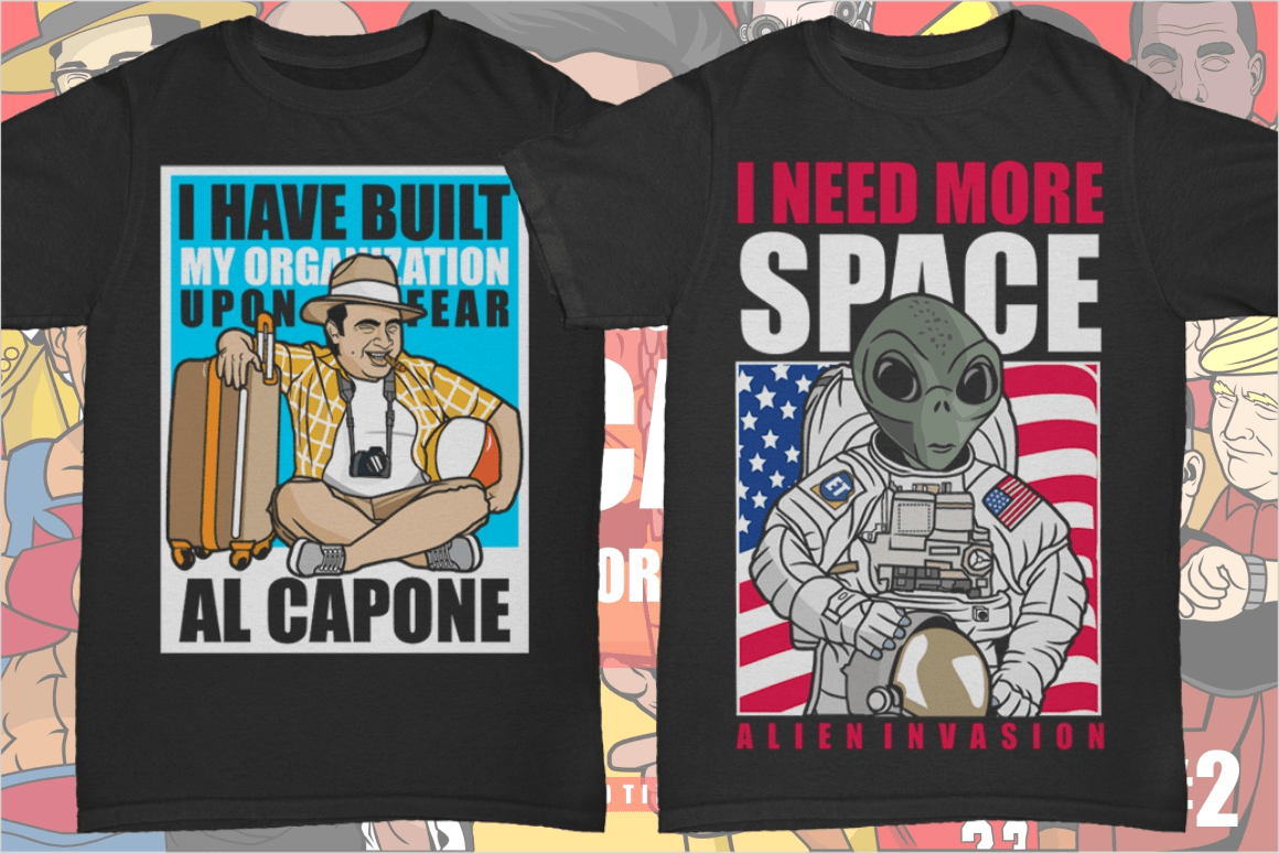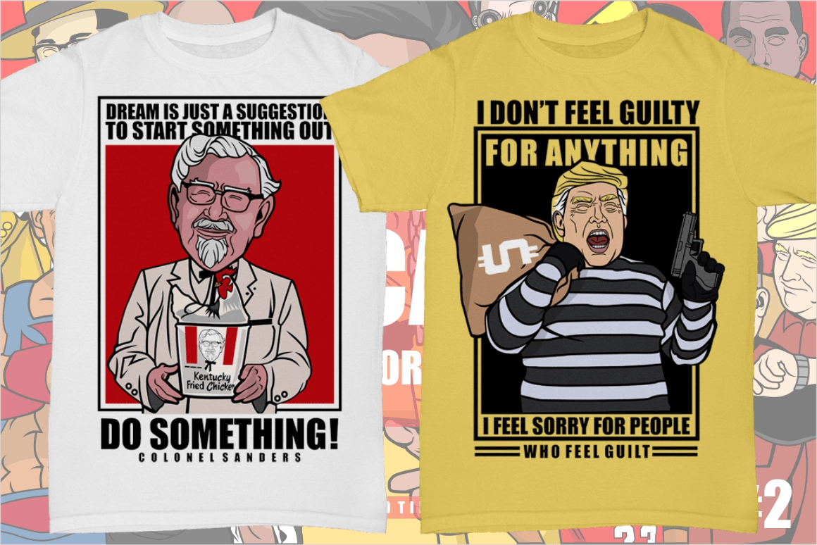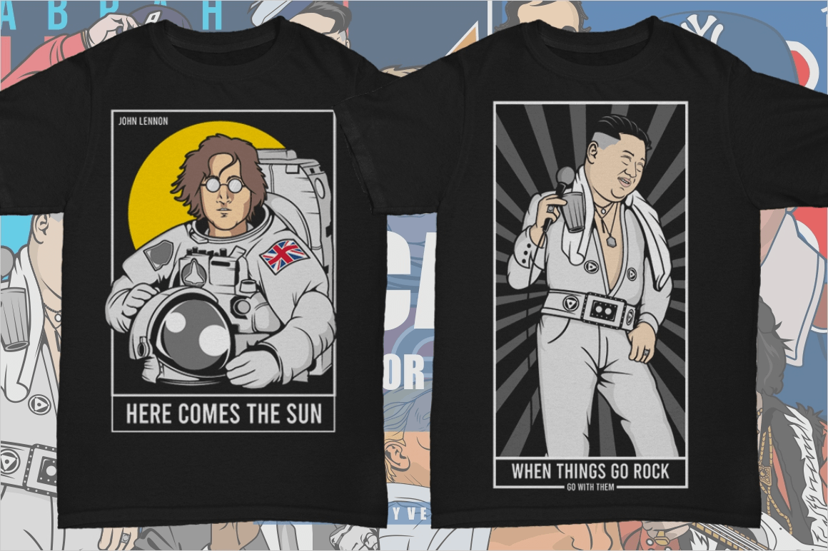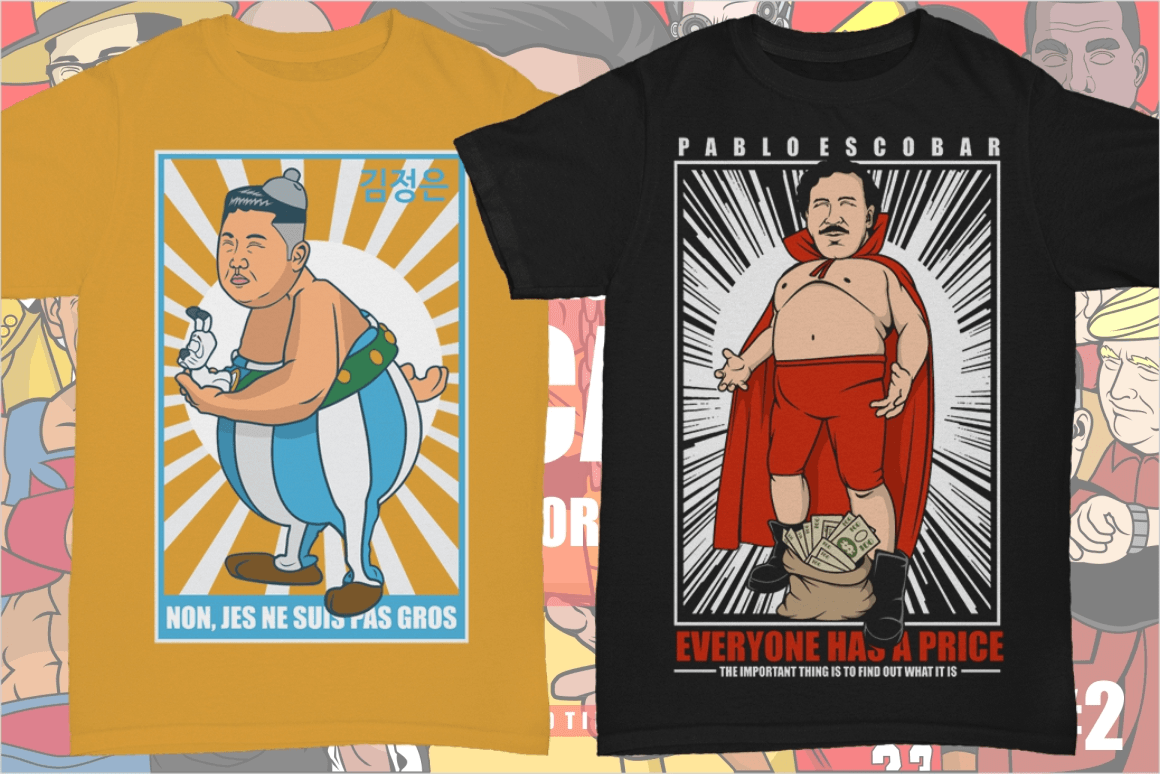 These illustrations feature a fun drawing style and include political figures like Donal Trump caricatures, Obama, Putin, Joe Biden & Kim Jong-un as well as movie stars & musicians like Dwayne Johnson, Kanye West and many more! Great for t-shirt printing, posters, digital media for satire, comedy, commentary and more