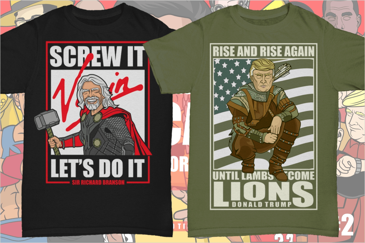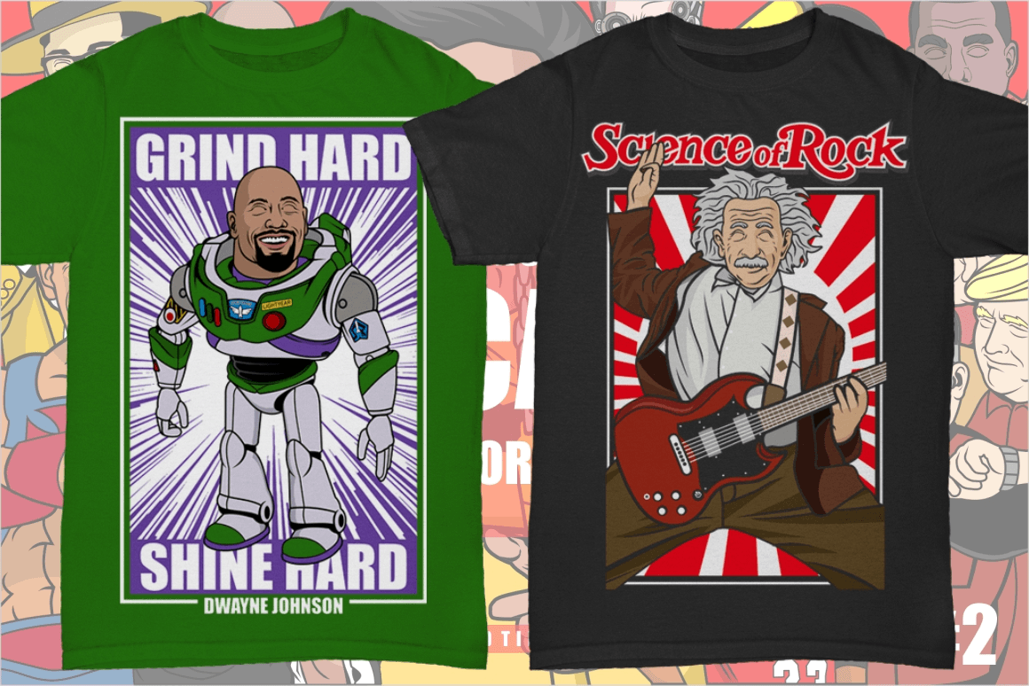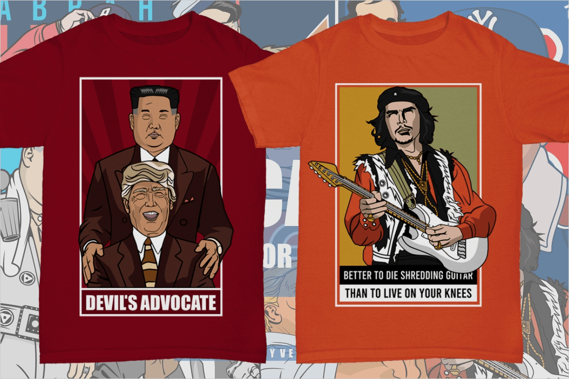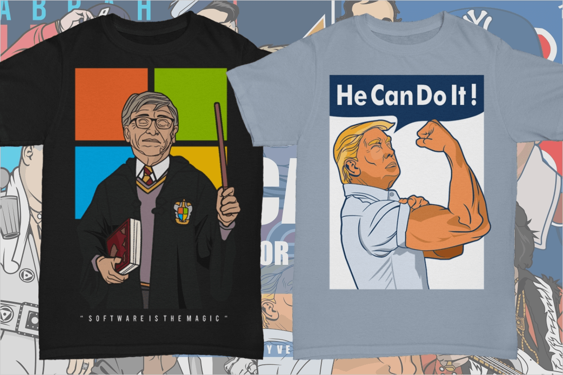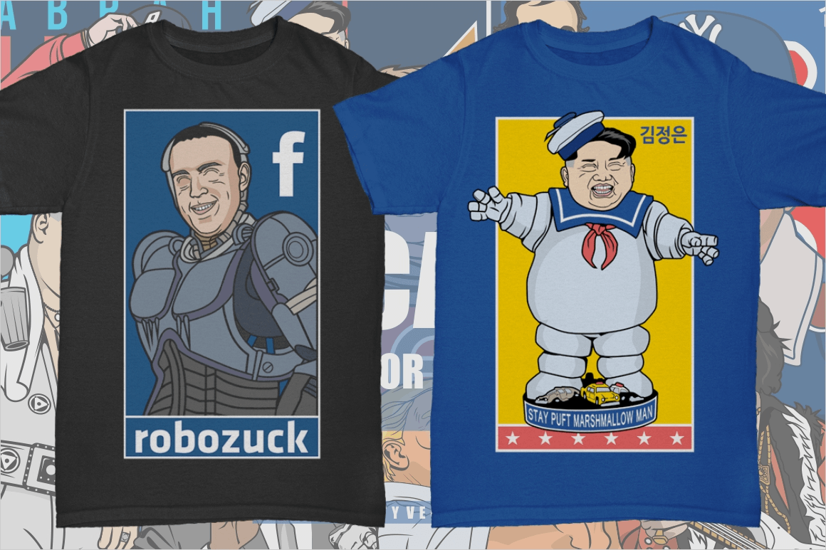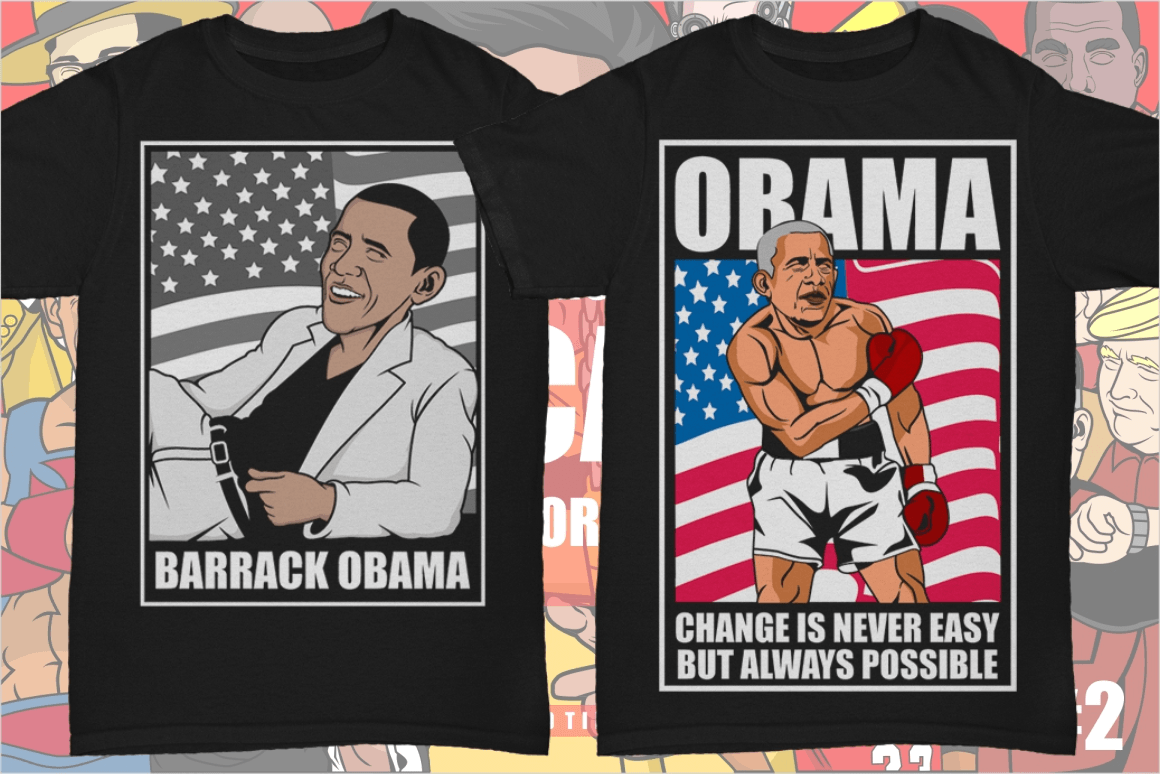 These illustrations feature a fun drawing style and include political figures like Donal Trump caricatures, Obama, Putin, Joe Biden & Kim Jong-un as well as movie stars & musicians like Dwayne Johnson, Kanye West and many more! Great for t-shirt printing, posters, digital media for satire, comedy, commentary and more