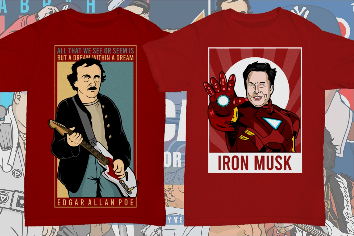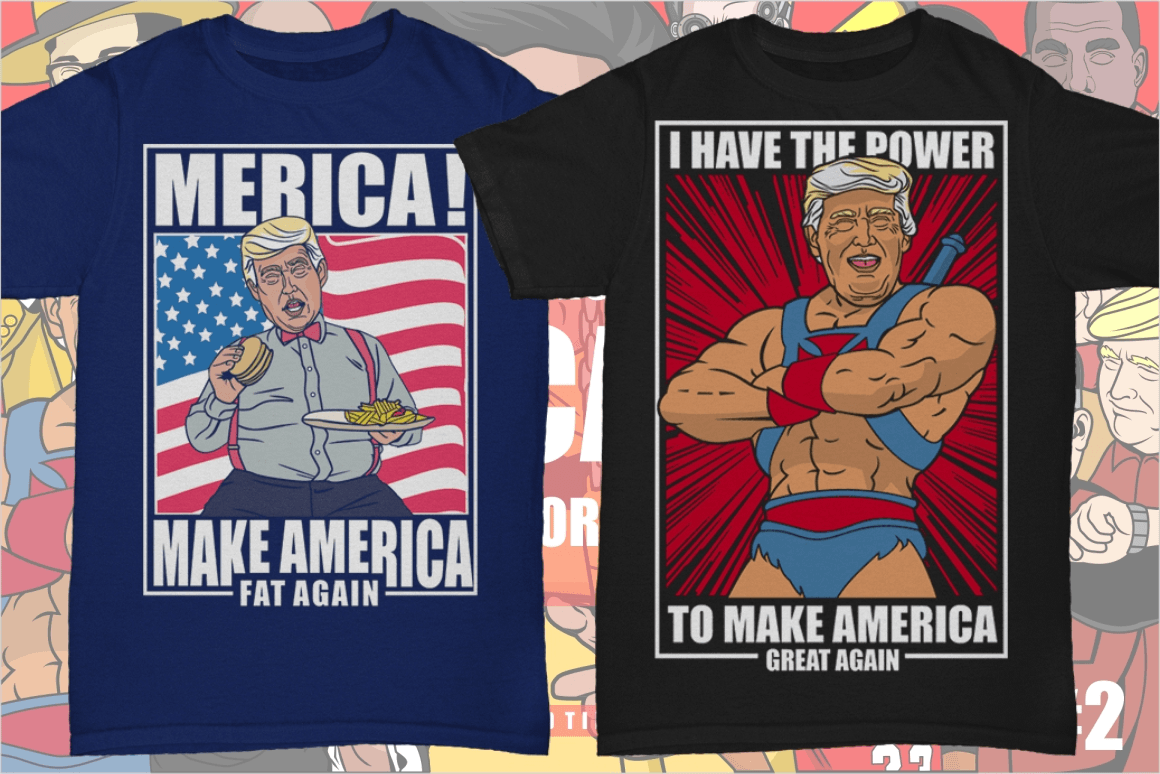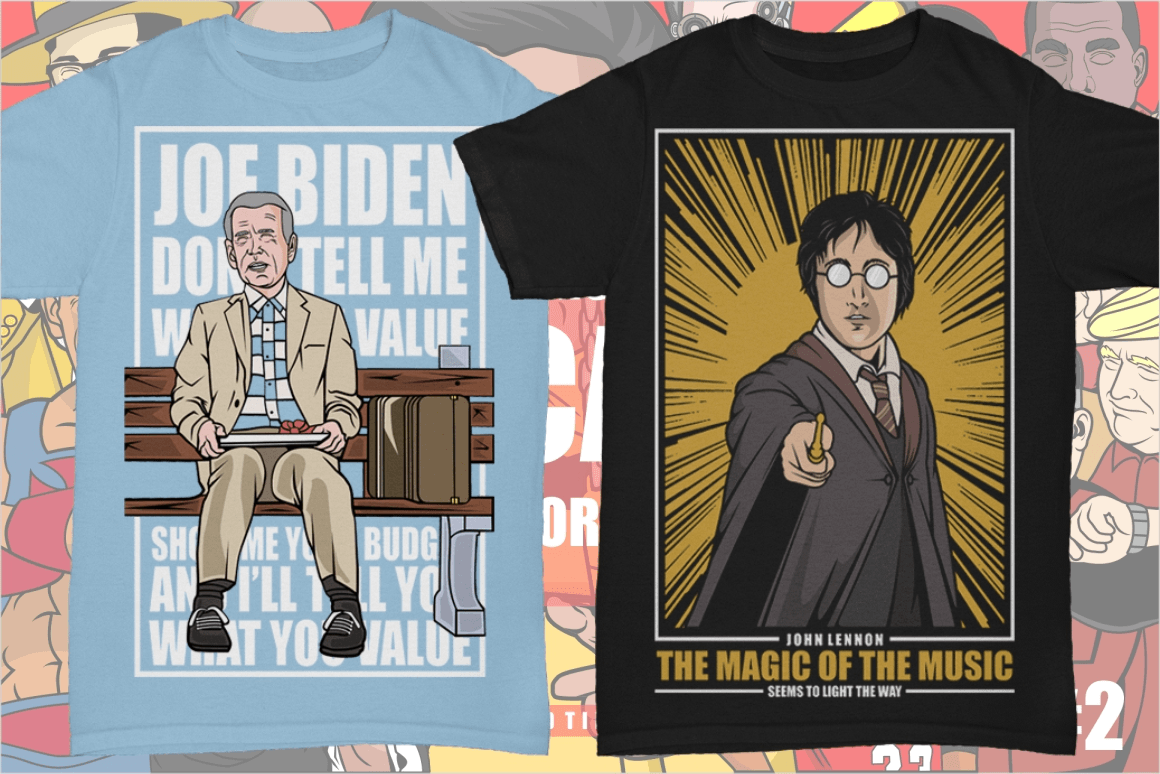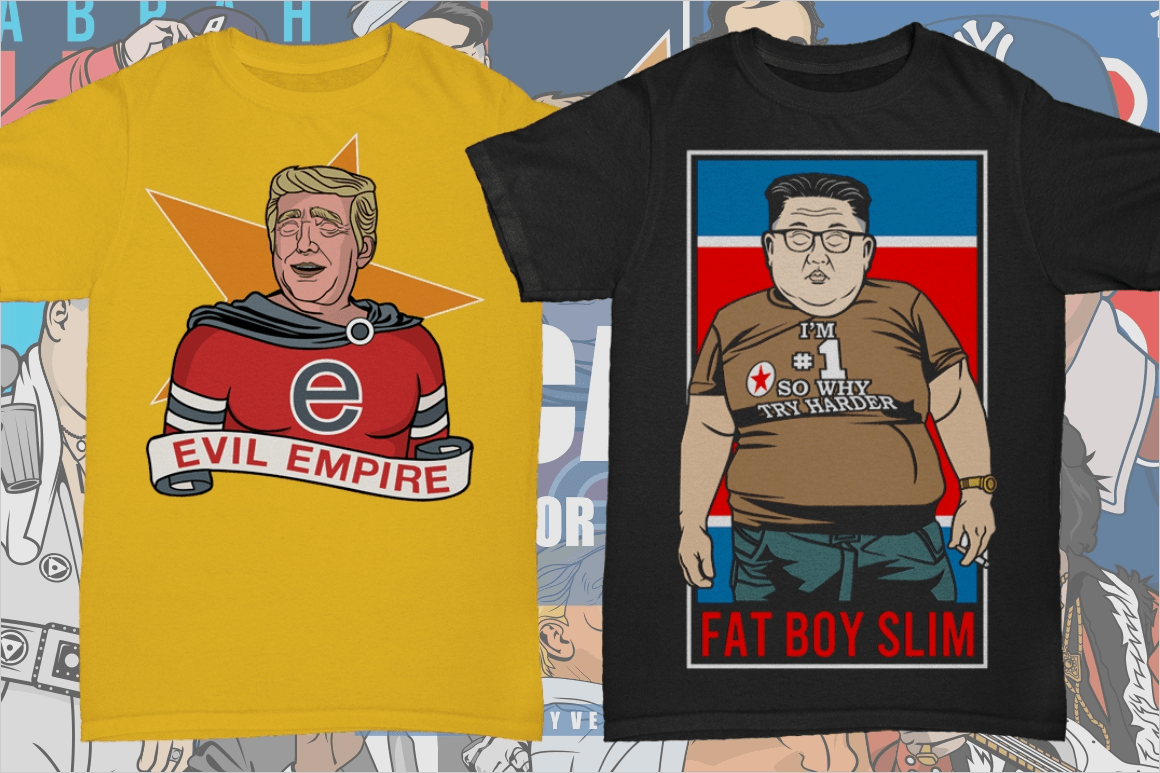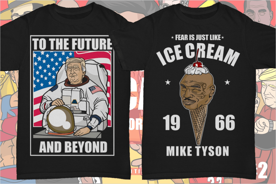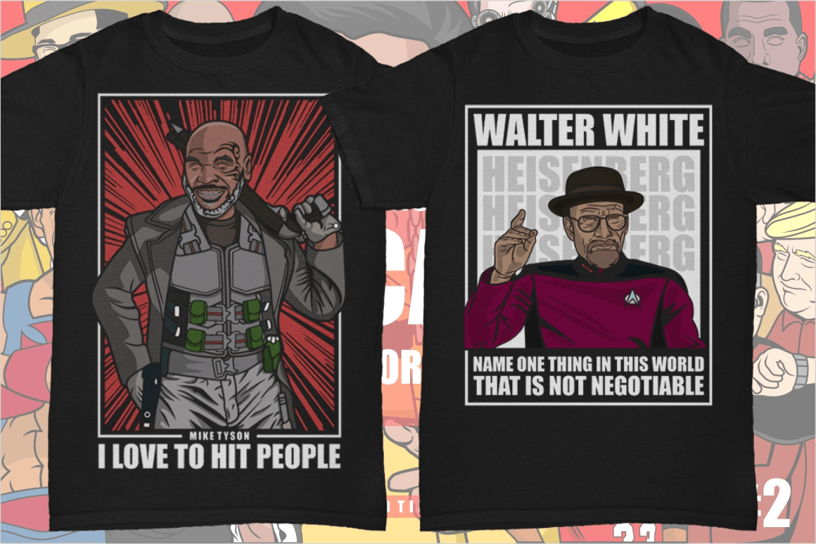 These illustrations feature a fun drawing style and include political figures like Donal Trump caricatures, Obama, Putin, Joe Biden & Kim Jong-un as well as movie stars & musicians like Dwayne Johnson, Kanye West and many more! Great for t-shirt printing, posters, digital media for satire, comedy, commentary and more