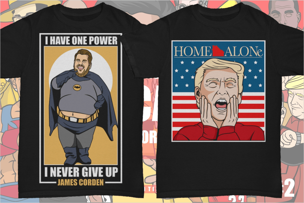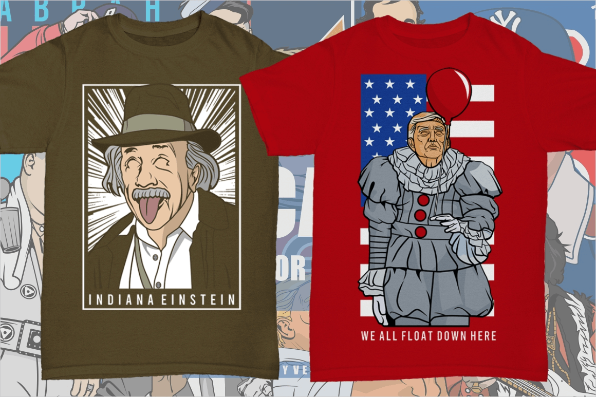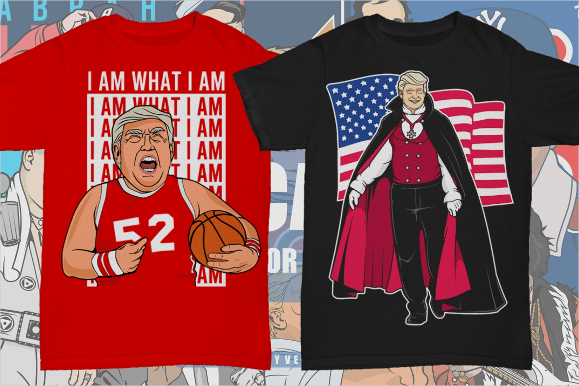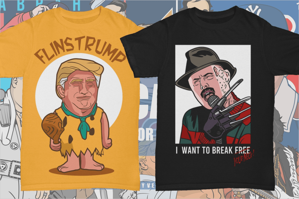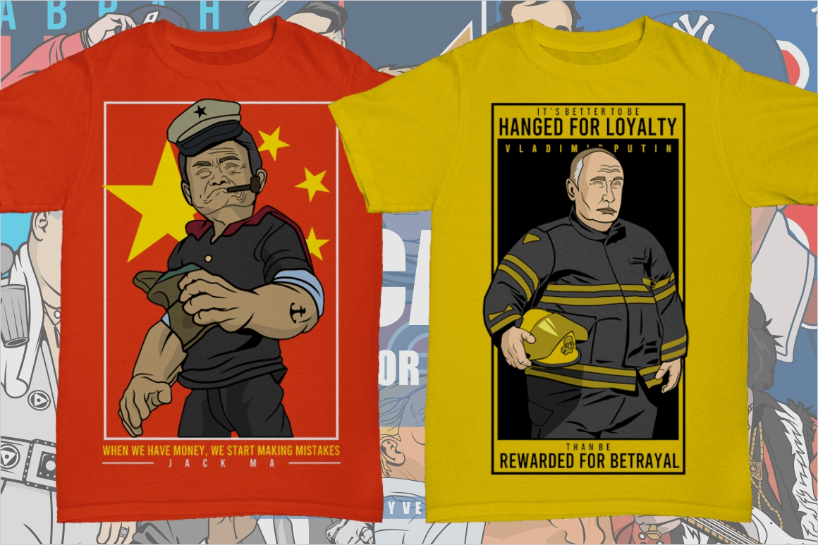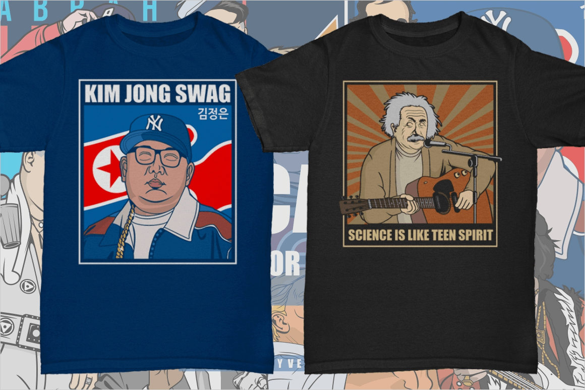These illustrations feature a fun drawing style and include political figures like Donal Trump caricatures, Obama, Putin, Joe Biden & Kim Jong-un as well as movie stars & musicians like Dwayne Johnson, Kanye West and many more! Great for t-shirt printing, posters, digital media for satire, comedy, commentary and more