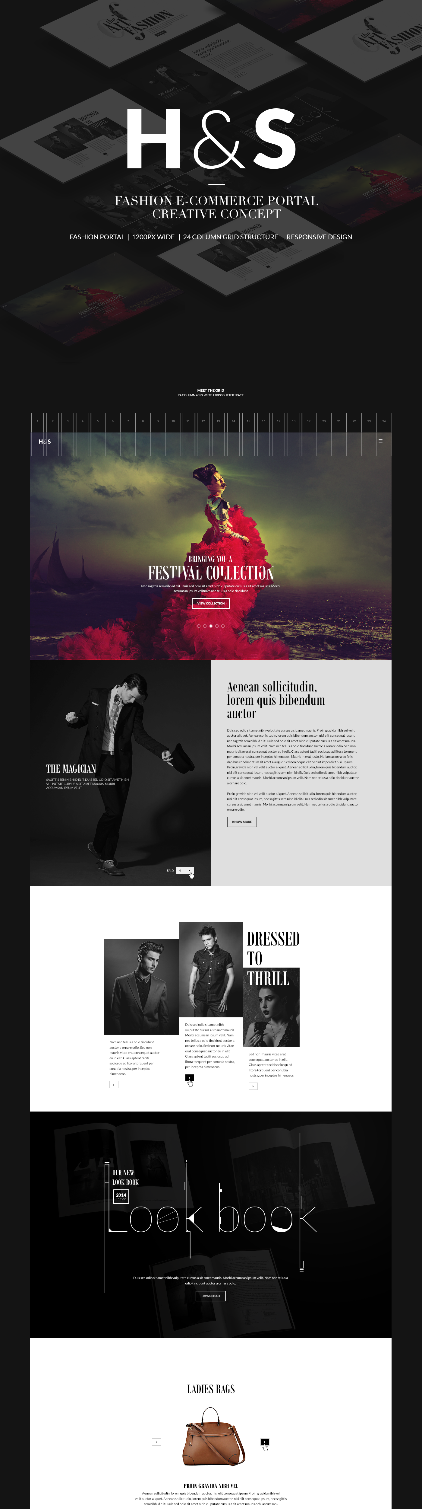 A concept of web design for fashion and eCommerce that features a 24-forty-pixel column grid and 10-pixel gutter space.