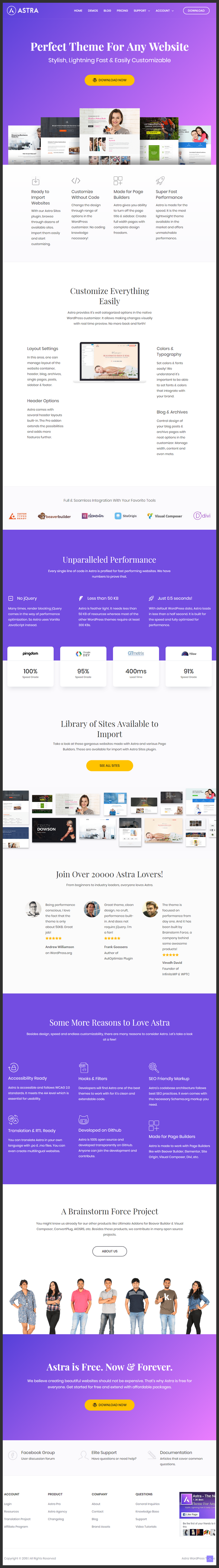 Astra, by Brainstorm Force is a WordPress theme with a slick layout and a strong focus on speed and SEO. It is easy to configure, and is compatible with all page builders, with a powerful Add-on package, WooCommerce support. It uses no jQuery, favoring instead vanilla Javascript to maintain its performance.