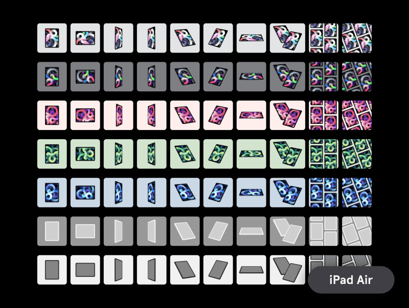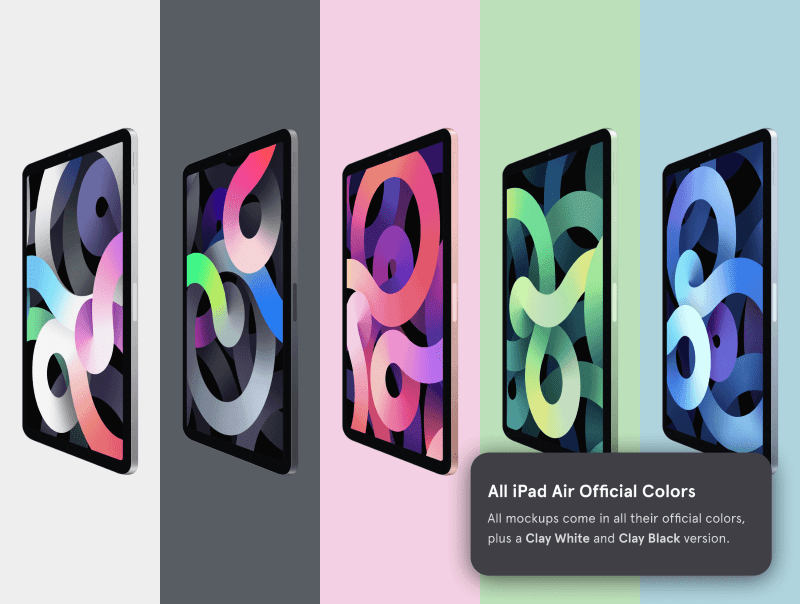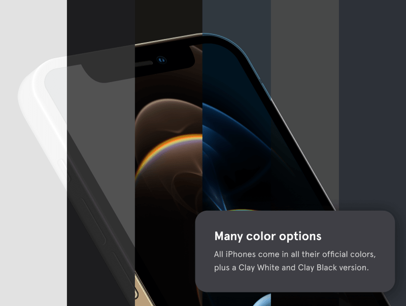 All mockups are 100% vector based, you can customize them however you want, change colors, resize, scale up & down, etc, and they feature a variety of premade colors and versions, including the official device’s colors + white clay & black clay variants, as well as a huge variety of different layouts and perspectives so you’ll have a wide selection of mockups to choose from to make your project look modern & slick