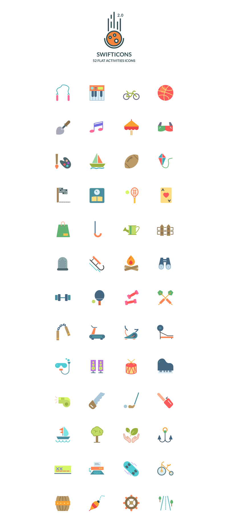 A set of 52 colorful flat icons featuring different fun activities, easily to integrate into several projects due to all of them are available in multiple formats, Ai, SVG, Sketch, and others. The file weighs about 3 Mbytes.