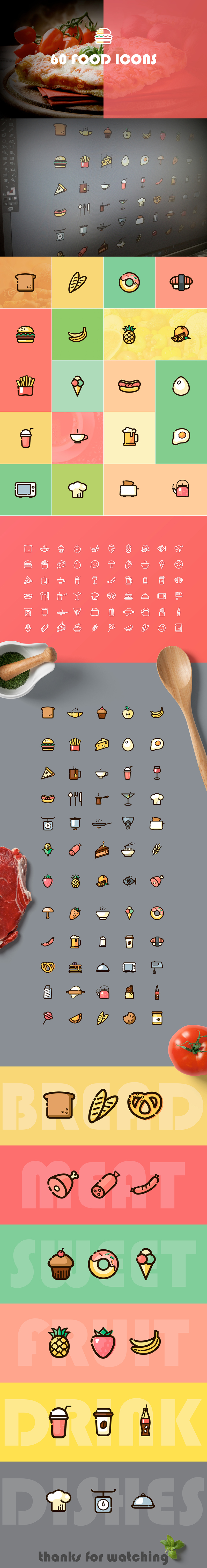 This set of 60 icons comes in AI format, full vector files and within two styles: Outlined and colored, categorized in ‘fruit’, ‘bread’, ‘drinks’, ‘sweet’, and more.