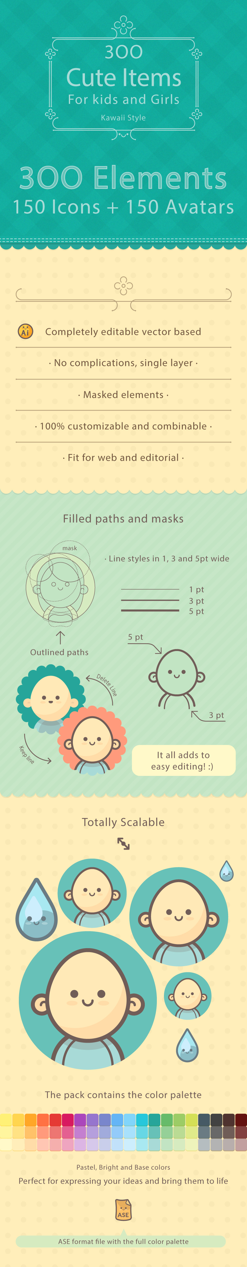 A set of 300 avatars and icons crafted in flat kawaii style completely editable, scalable and combinable in vector format featuring masks, 3 different line weights (1pt, 3pt and 5pt), a pastel, bright and base color ASE palette, and extra elements regarding sports, food and more.