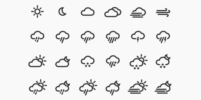 A collection of 24 weather-like icons. They are created with a flat and outlined style, a perfect solution to use with photographs as backgrounds. The set includes the regular symbology for the sun, some clouds, rain, wind, lightnings and the moon. They are free to use and were designed by Jakob Treml, provided in an organized AI file.