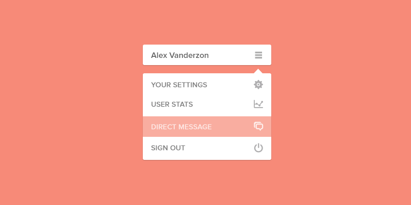 A drop-down concept with a clean and modern look created by Dribbble user Alex Vanderzon. The nice color palette includes white and soft red tones, with icons representing each option. Subtle effects can also be applied when hovering on the element. You can also download the original PSD, for free.