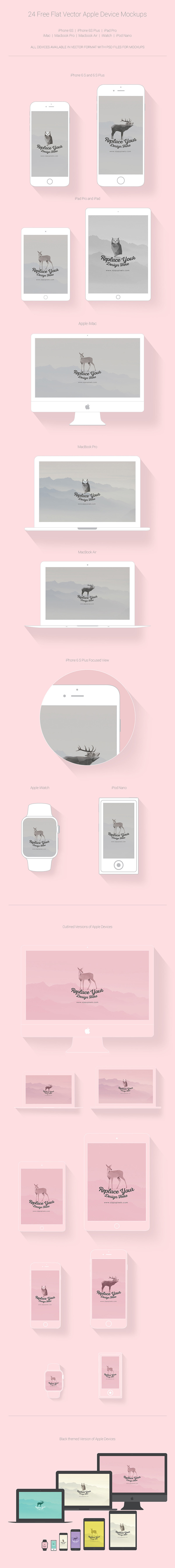 A set of 24 flat mockups featuring all sorts of Apple devices such as iWatch, iPhones, iPods, iPads MacBooks and iMacs.