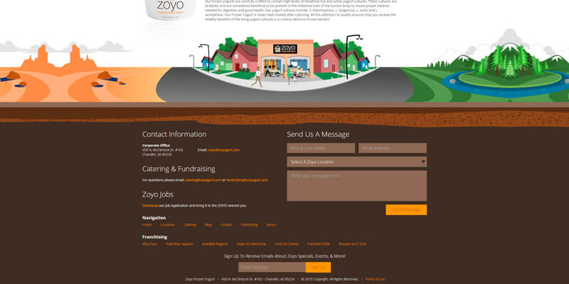 A nice flat illustration for a footer that definitely catches your attention to get to see the underground contact form, newsletter subscription, contact information, among more interesting features.