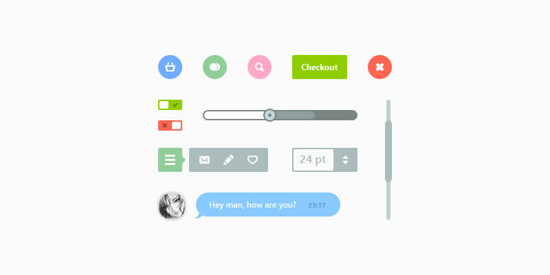 A free collection of modern web elements created with a flat design and minimal colors. These elements can be used in your web and design projects. The free package includes sliders, radio buttons, icons and more.