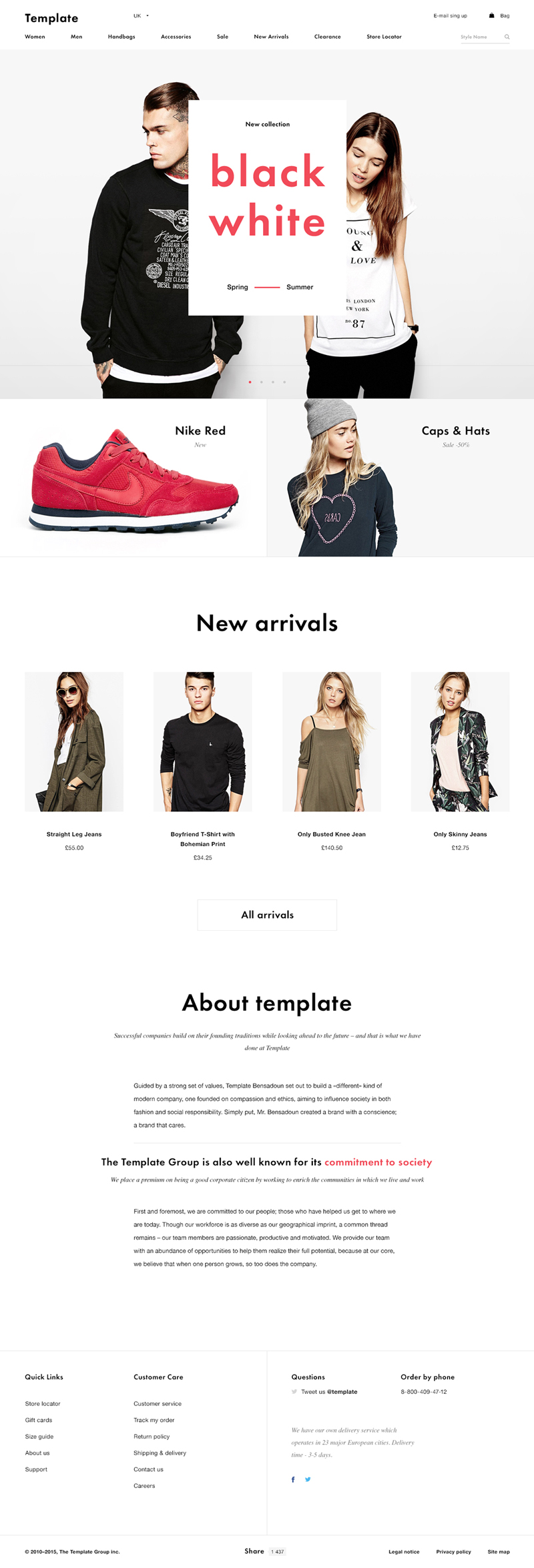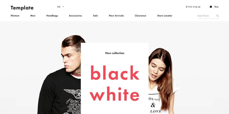 A black and white PSD template created with minimal style, using big images and organized nicely in order to create a top-notch online store. The template has menu, big featured image, additional products, new products, about area and more.