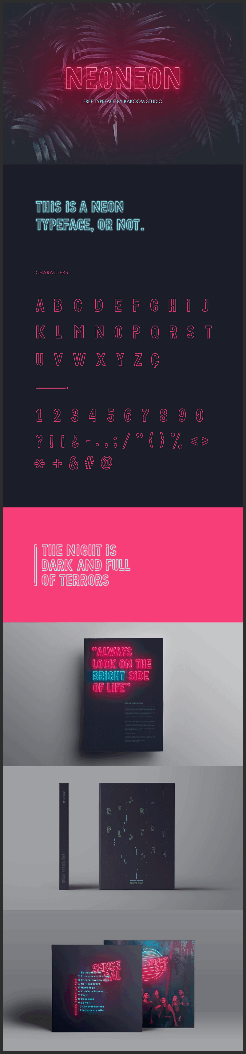 Great looking typeface with a slick design and a neon effect, engineered by Bakoom Studio. It features unique looking characters with soft curvatures for letters from A to Z, as well as numerals and basic punctuation and symbols.