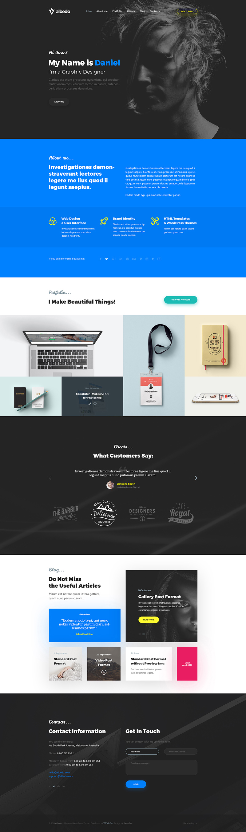 Albedo is a personal website template made in PSD format, which includes several design elements, totally editable and scalable thanks to vector shapes. The template has areas for intro, features, portfolio, clients, blog and contact area.