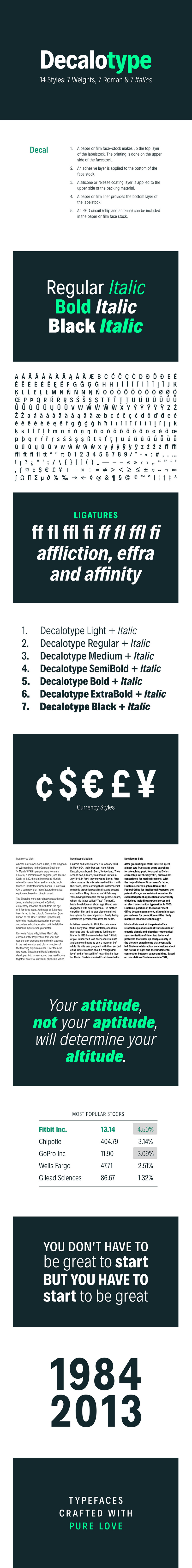 Decalotype is a multi-purpose, narrow and sturdy sans serif, it includes 14 styles, 7 weights, 7 roman and 7 italics.
