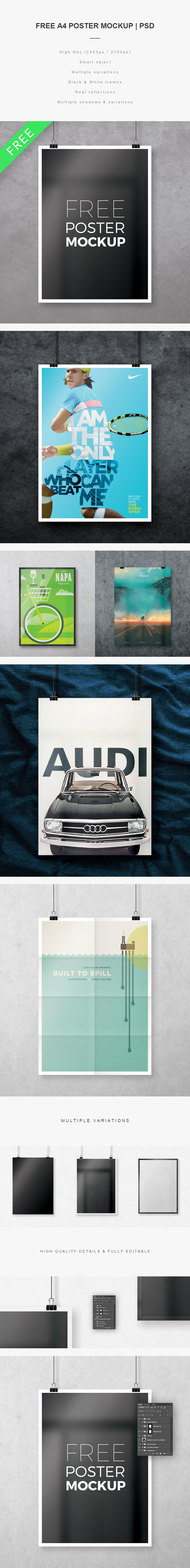 An A4-size Poster Mockup which comes in PSD format and features smart objects, real reflections, multiple shadow and frame variations, and high resolution (2433px x 2708px). Created by Mats-Peter Forss, licensed free for personal and commercial use.