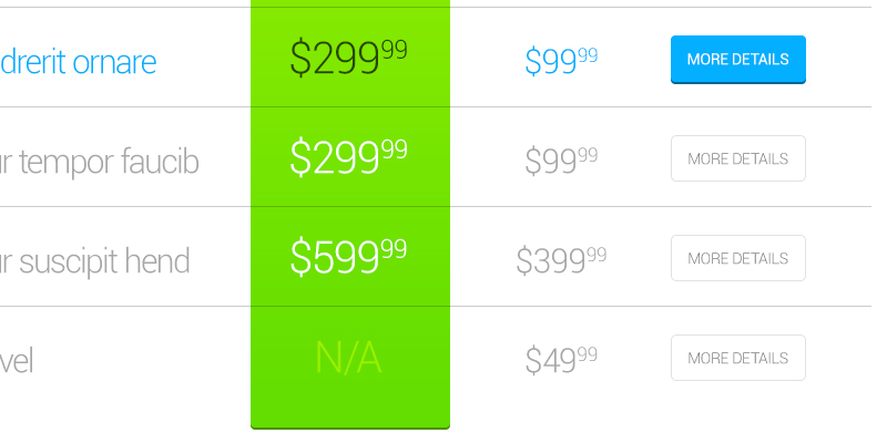 This is a simple and fresh table for product pricing with buttons, a hover effect and info line. It is divided into three parts, the first for product description, the second for some values and the third one for buttons with links with more details. The whole design has a nice flat style, with clear and light typography, easy on the eyes, and an overall bright feel.