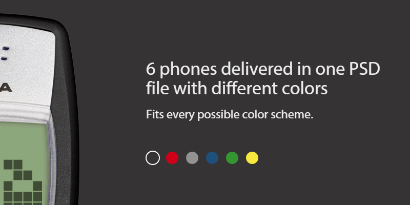A beautiful retro nokia mockup made in PSD format, easily editable thanks to vector shapes; the pack comes with 6 mockups, in different colors and including detailed shapes. Their resolution is 2704 x 4065px, with 72 DPI. These mockups were created by Aerolab.