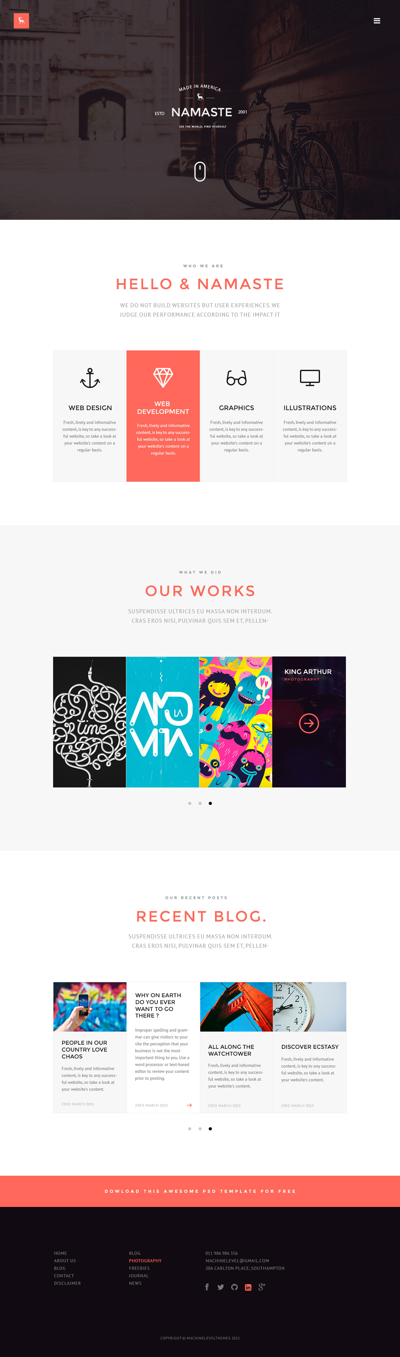A beautifully designed PSD template for a one-page website. It was created with a flat style, with yoga and relaxation websites in mind. It has a big featured image header including logo and menu, “Who we are” area, “works” with thumbs, “recent blog posts” including a little content widget, and a footer. It was made by Binay Shrestha.