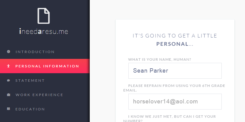 iNeedAResume is a simple step-by-step online guide to help you set up your resume in no time. It asks for your personal information, a little statement, your work experience, your education, skills and final settings. Lastly, you can download your resume as PDF. This tool is free.