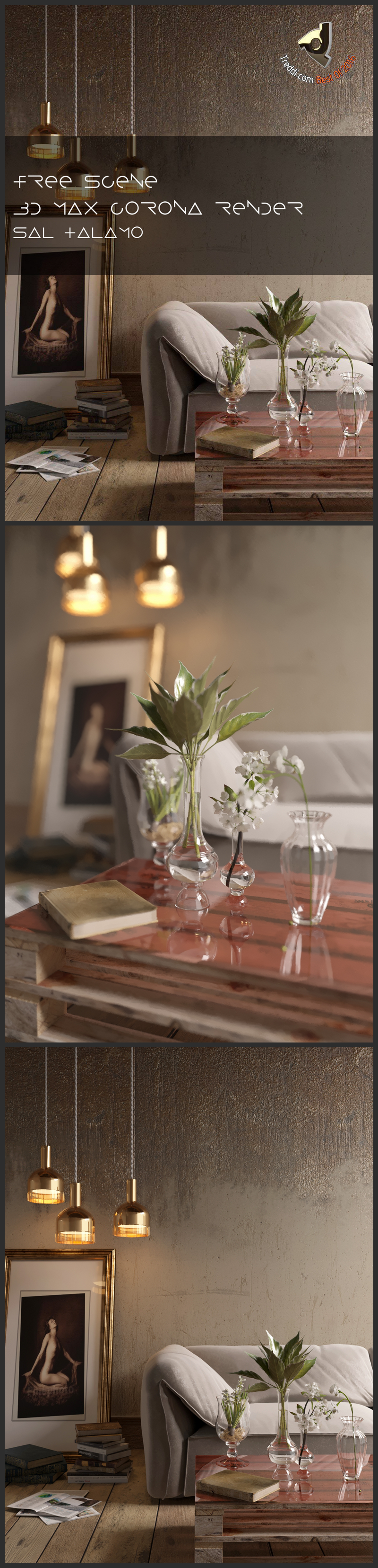 An elegant scene in .Max format, featuring a couch, table, several books, transparent glass flowerpots, and a painting. It has an earthen color scheme trend followed by most of the items present, and an amazing use of lighting, created by Behance user Sal Talamo.