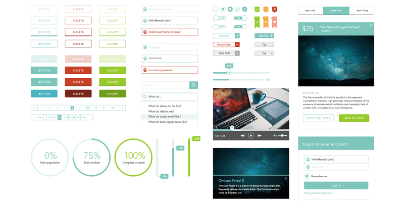 Persei 8 is a UI kit designed and built in Sketch by Jerome Villagracia. It was made in a flat design, complemented with some minimally-styled elements. It is quite intuitive and features buttons, sliders, loading bars, among others.