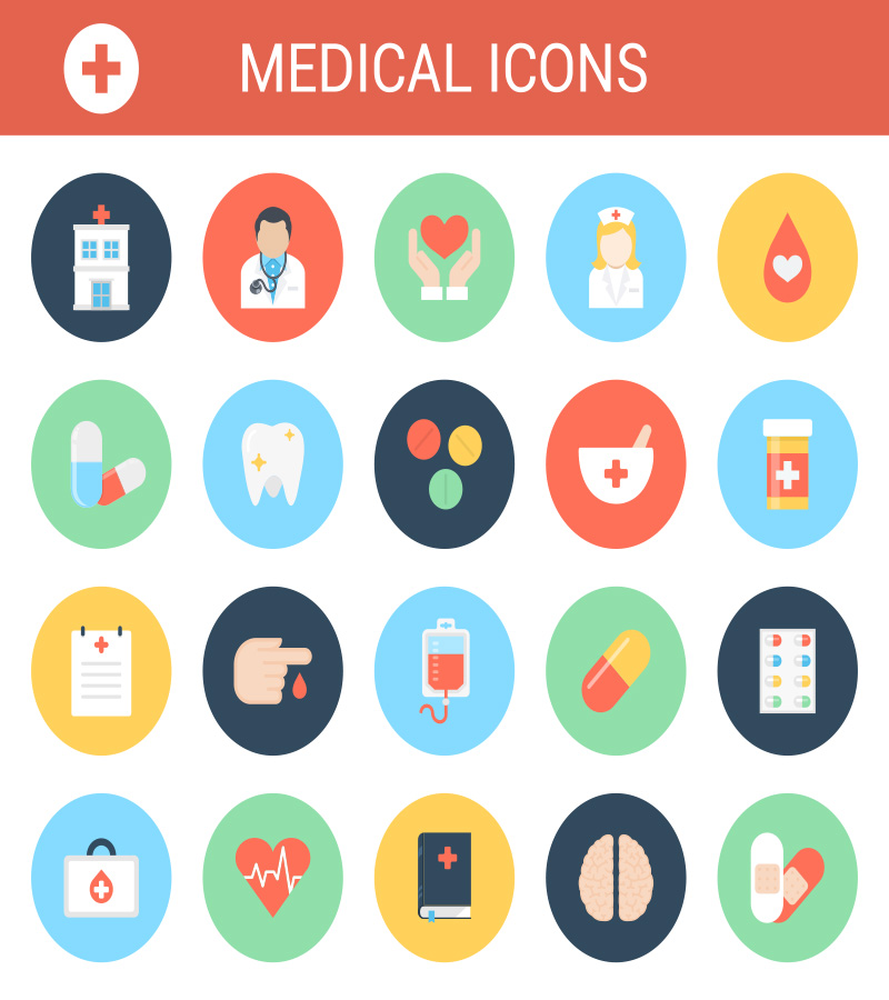 Neat freebie designed by Vecteezy, this is a set of 20 high-quality free vector icons designed in a flat style with a medical motif. Includes several metaphors like blood transfusion, pills, dental health, heart rate, and many others.