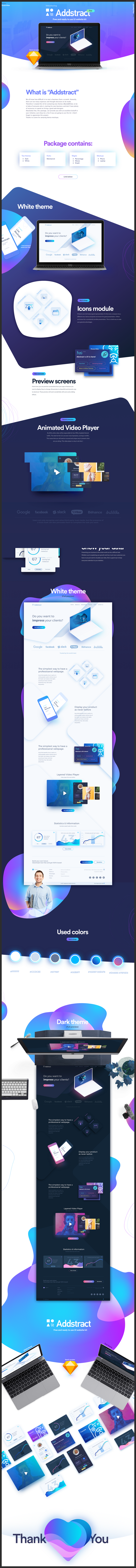 From Behance user Daniel Mitev, this amazing UI Kit dubbed Addstract UI is a quick solution for kickstarting a project with a professional looking UI that comes in two flavors: White and Dark.  Its design with gradients gives it a fantastic, unique feel, and among its features it has an animated video player, easily interchangeable icons module, and many more neat features.
